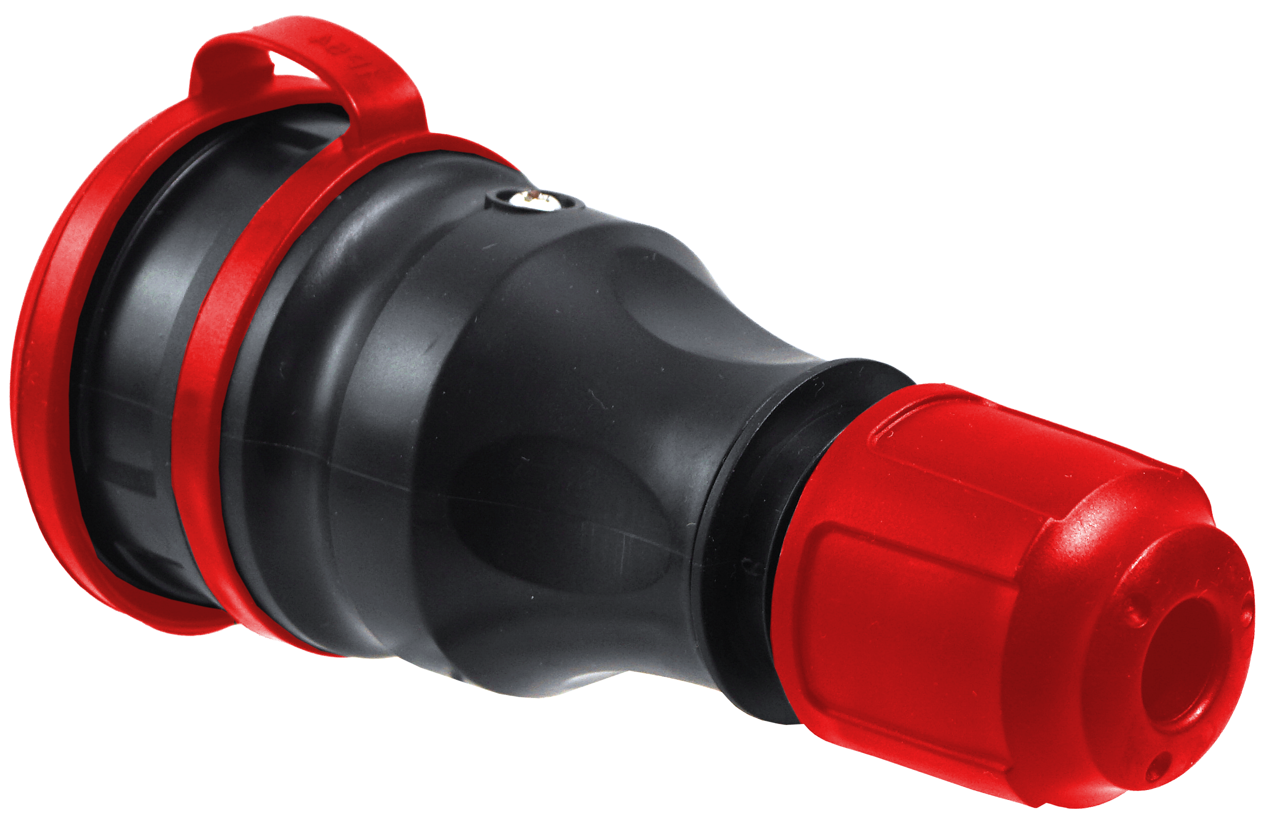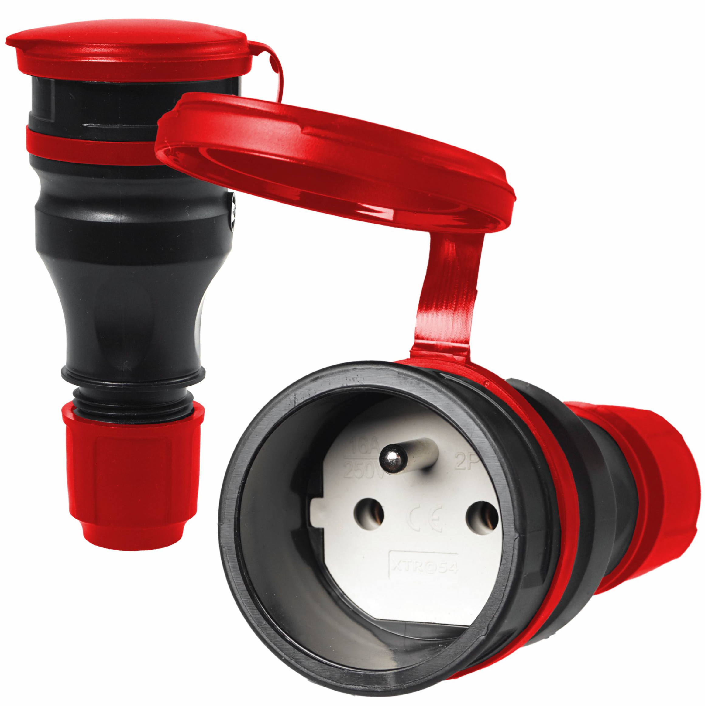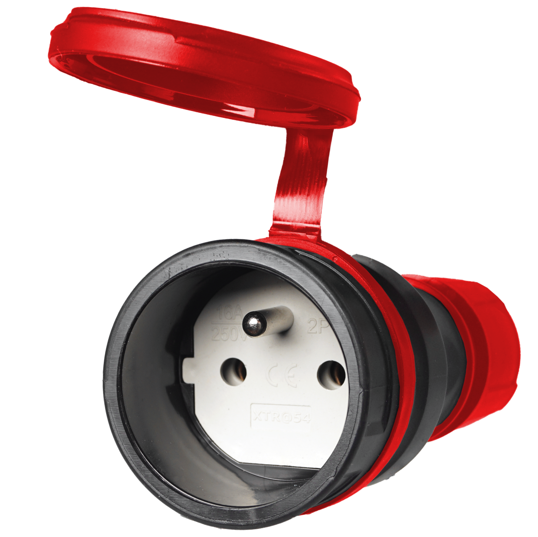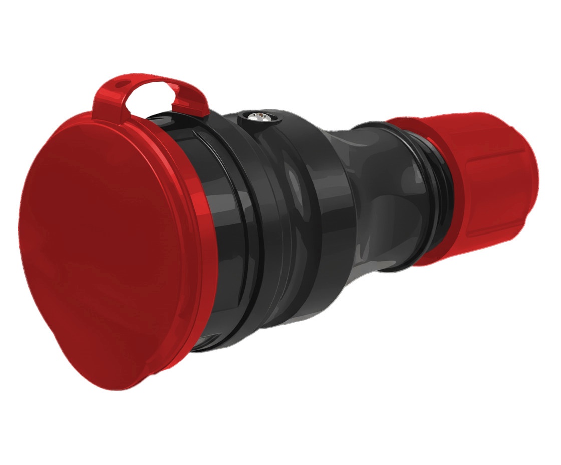 Gniazdo prądowe, gumowe, hermetyczne- IP54, do montażu na kabel 16A 250V, 2P+Z, z klapką, w kolorze czarno-czerwonym.