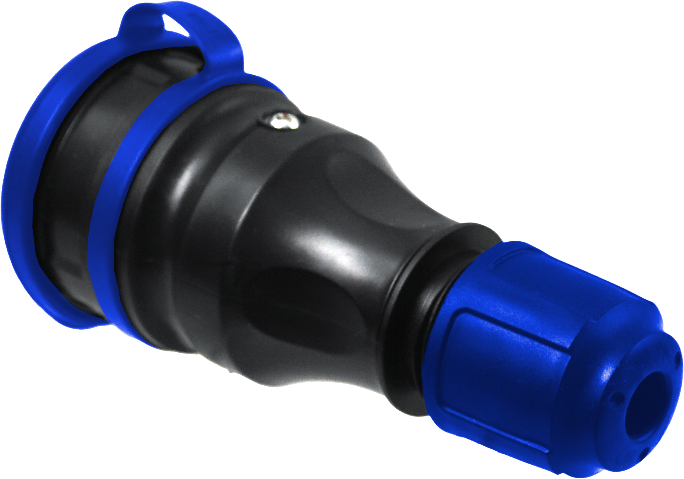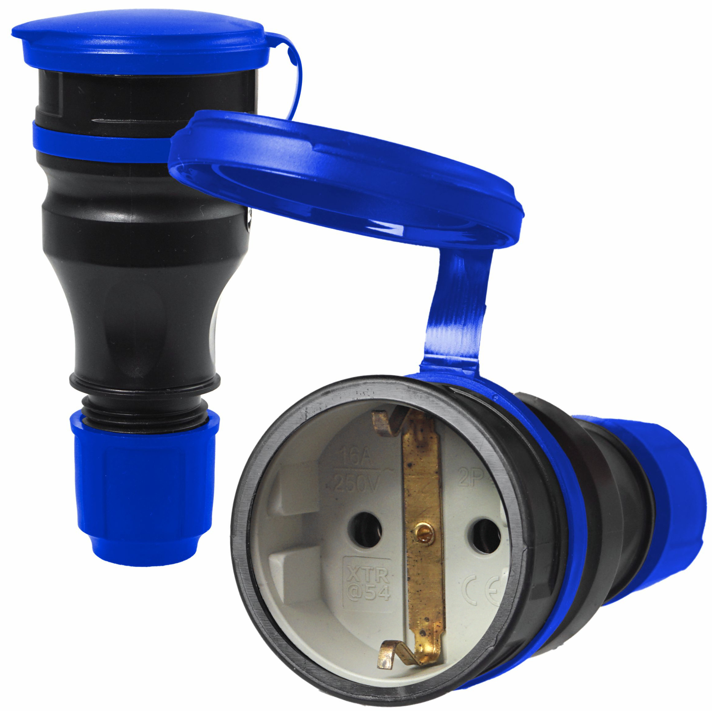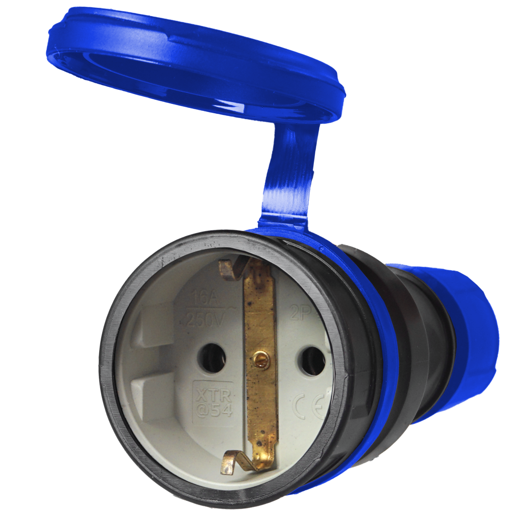 Gniazdo prądowe, gumowe, hermetyczne IP54, Schuko, do montażu na kabel 16A 250V, 2P+Z, z klapką, w kolorze czarno-niebieskim.