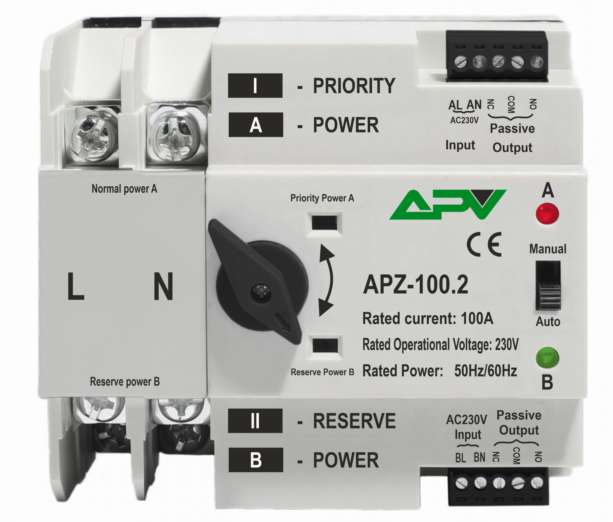 1-FAZOWY AUTOMATYCZNY PRZEŁĄCZNIK ZASILANIA, 2P, 100A, 230V, DO FOTOWOLTAIKI, MARKI APV.