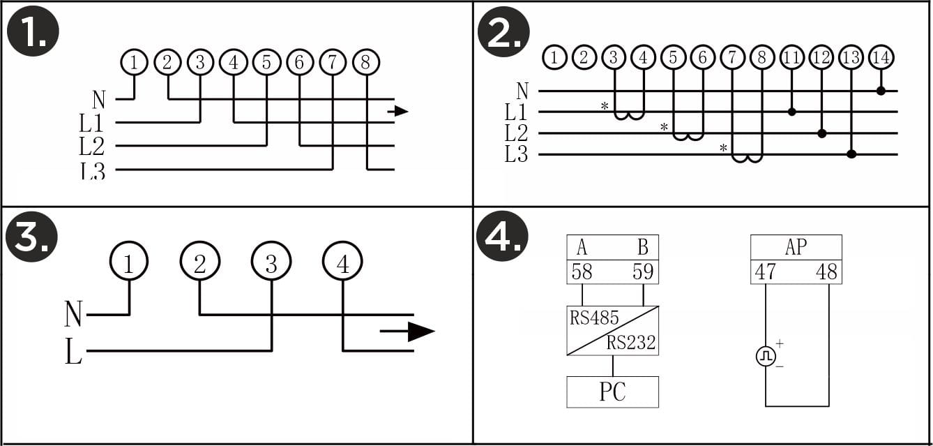 - Trójfazowe, czteroprzewodowe podłączenie bezpośrednie,