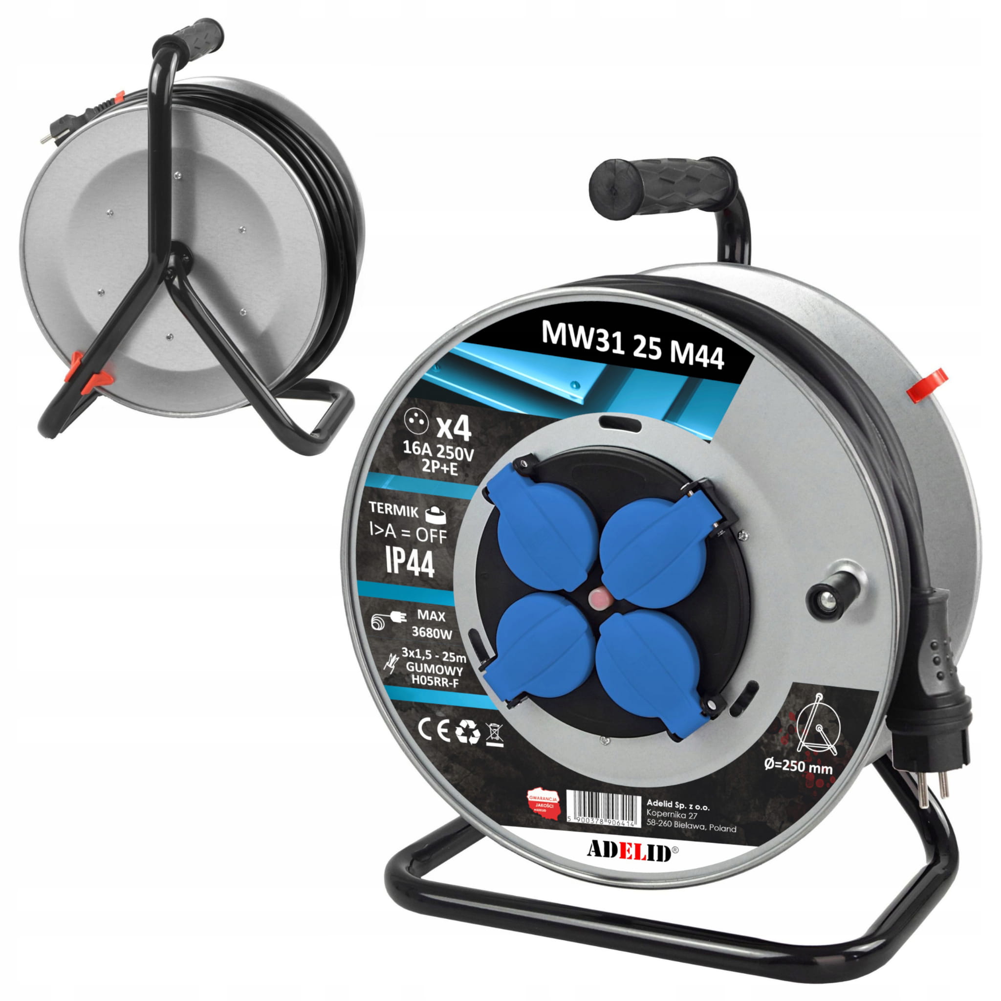 Oryginalny przedłużacz budowlany na bębnie metalowym z 4 gniazdami 16A 2P+Z 230V IP44kabel gumowy OW H05RR-F 3*1,5 25M