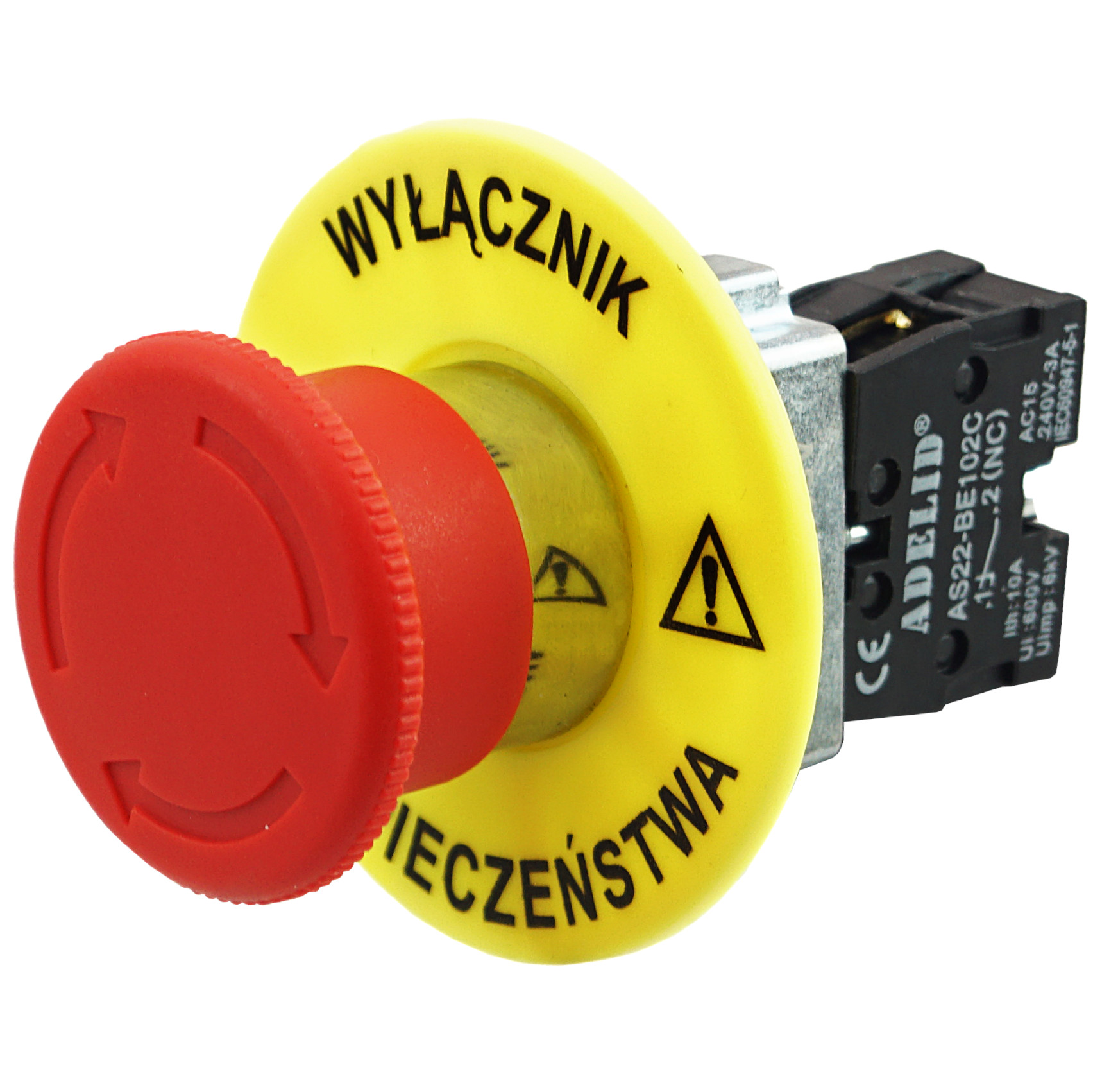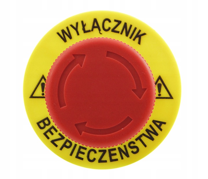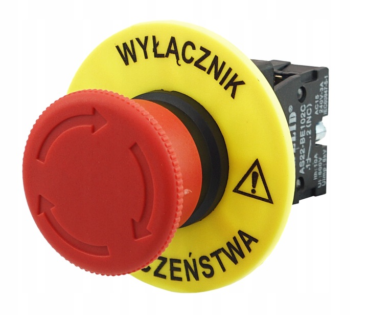 Działanie: przycisk bezpieczeństwa blokowany poprzez wciśnięcie grzybka, odryglowywany poprzez obrót.