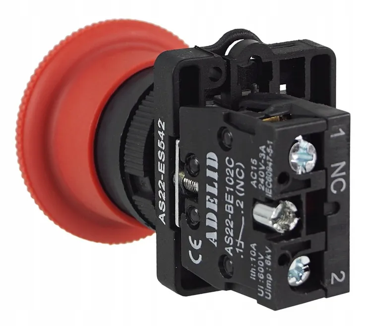 Działanie: przycisk bezpieczeństwa blokowany poprzez wciśnięcie grzybka, odryglowywany poprzez obrót.