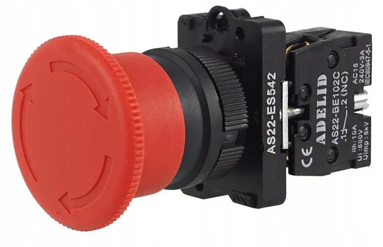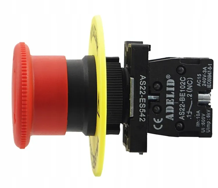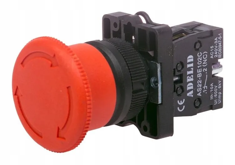 Oryginalny przycisk dłoniowy, bezpieczeństwa, grzybek czerwony marki ADELID, z tabliczką ostrzegawczą "WYŁĄCZNIK BEZPIECZEŃSTWA"