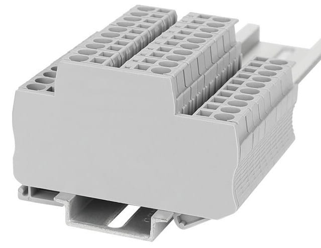 - Zaślepka zabezpiecza przed przesuwaniem się złączek, zamontowanych na szynie DIN.