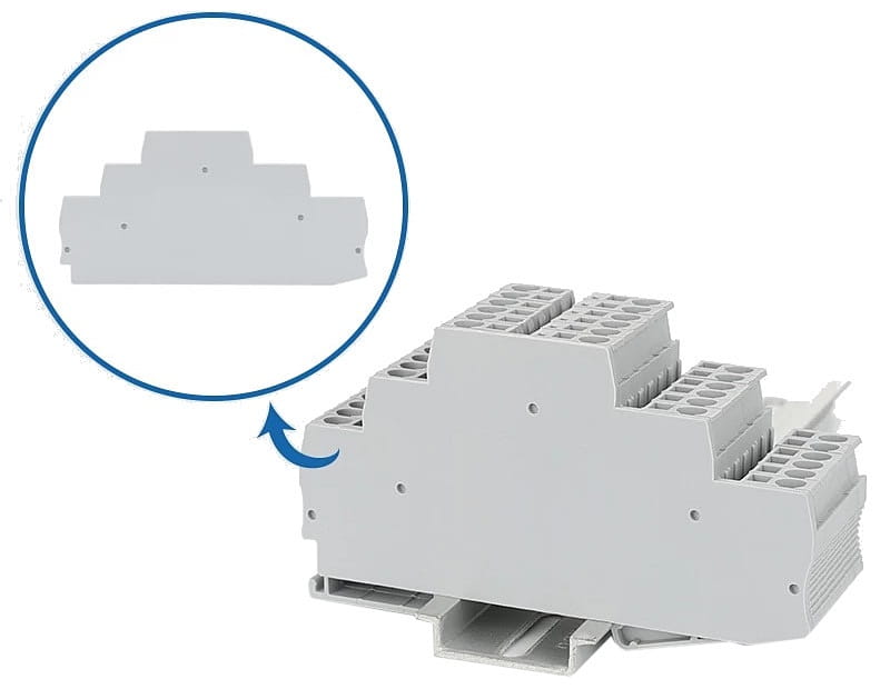 - Zaślepka zabezpiecza przed przesuwaniem się złączek, zamontowanych na szynie DIN.