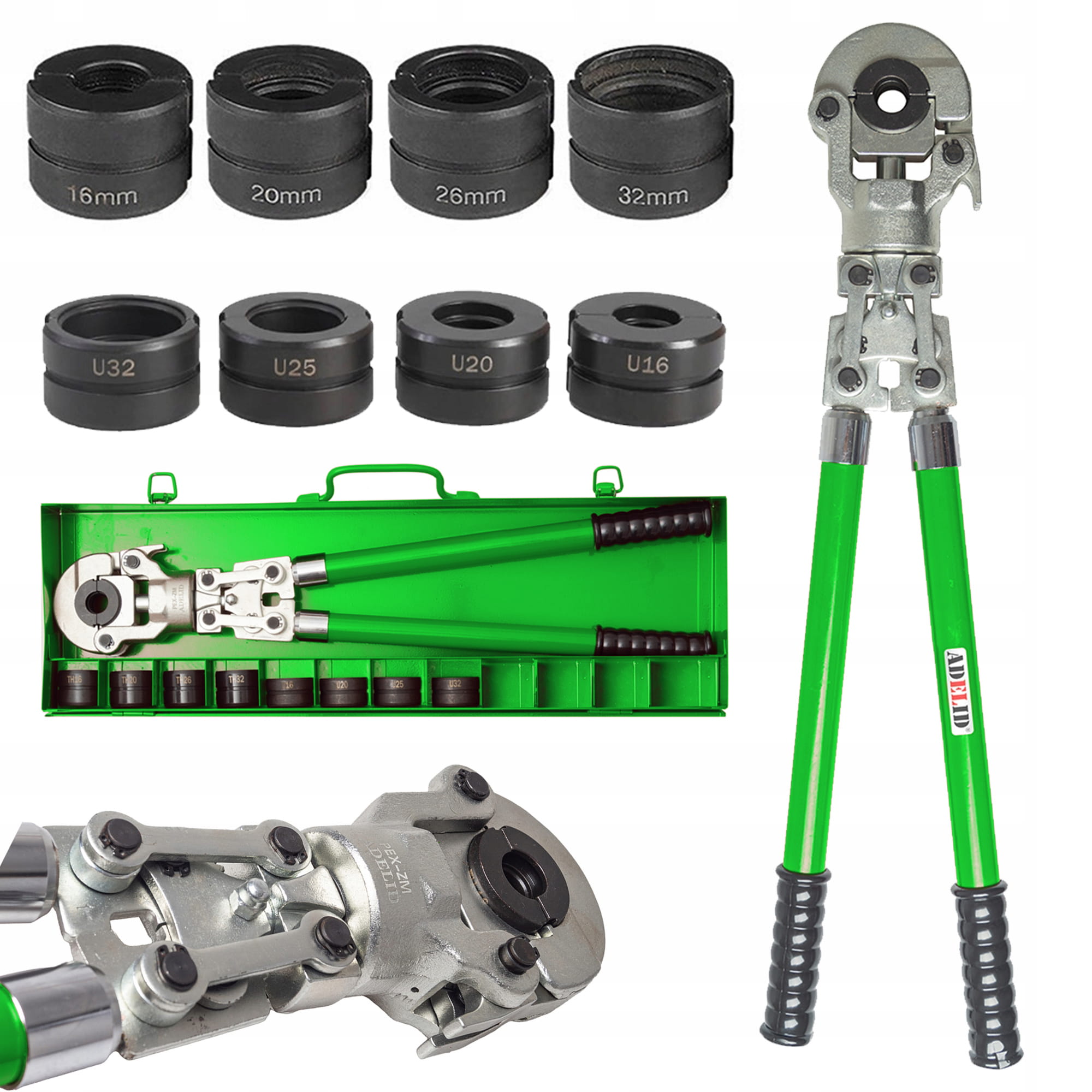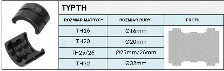 - W zestawie dostępne są 4 matryce zaciskające typu TH o następujących rozmiarach: 16, 20, 26, 32mm.