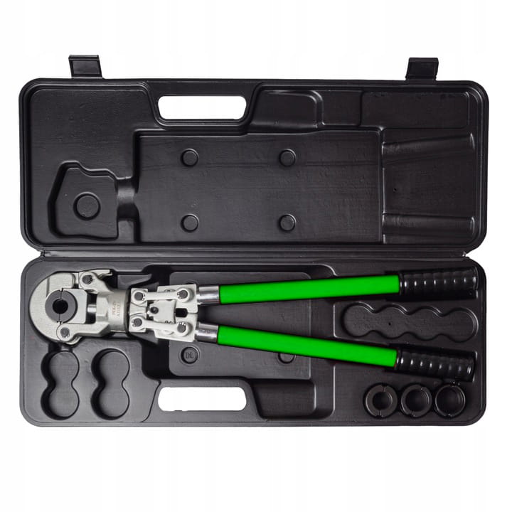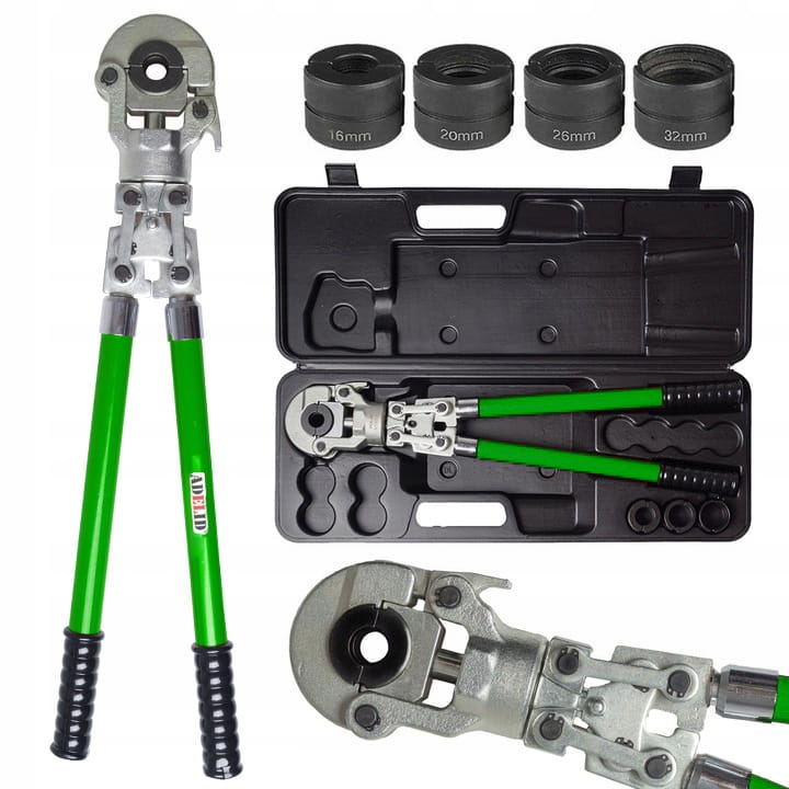 Oryginalna, ręczna praska hydrauliczna do zaciskania złączek na rurach PEX-AL-PEX, PERT-AL-PERT z zestawem 4 matryc, marki ADELID, w zakresie zaciskania od 16 do 32 mm.