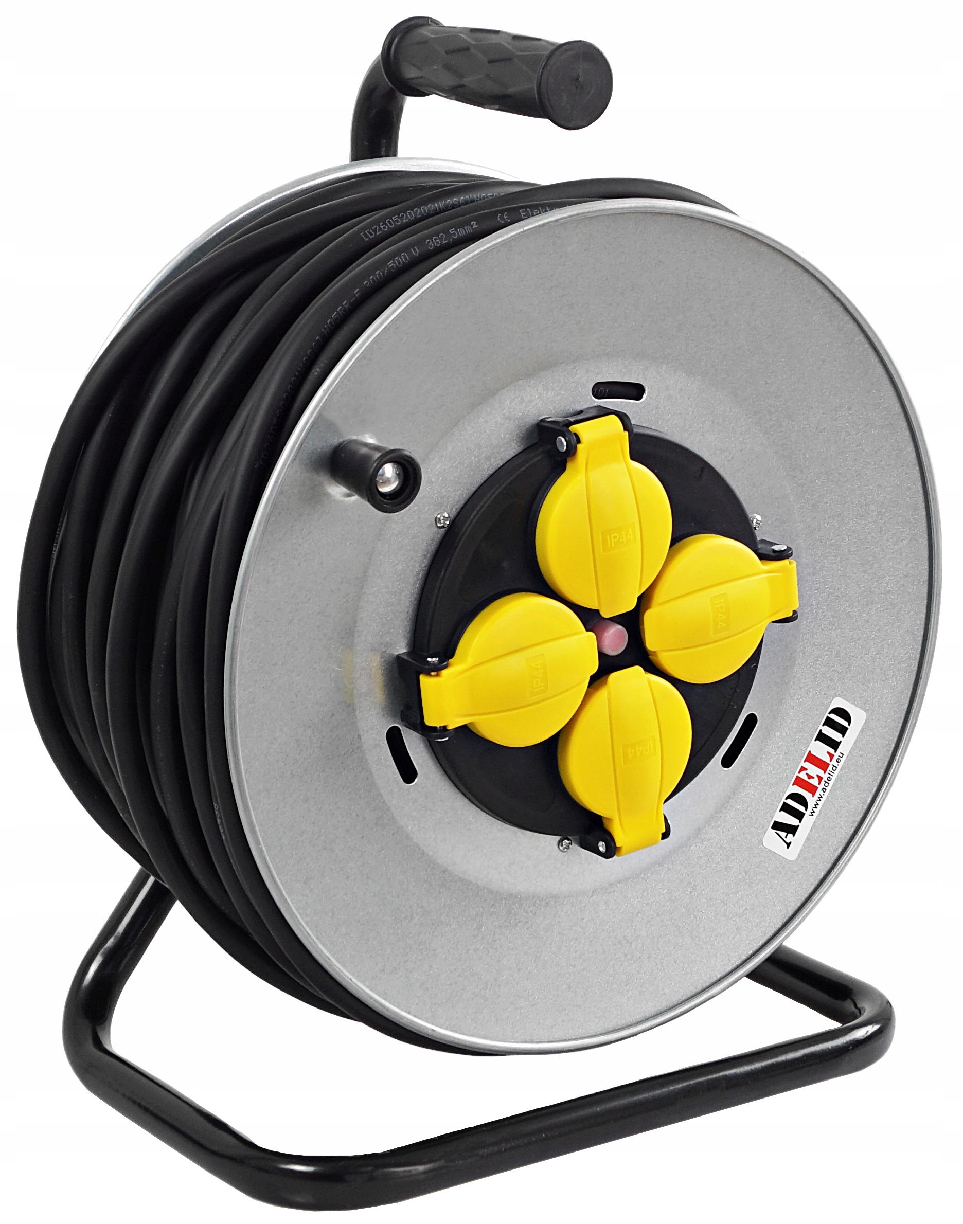 Oryginalny przedłużacz na bębnie, Trianga metal, IP44, z 4 gniazdami 16A 2P+Z 230V IP44, kabel polwinitowy H05VV-F 3*2,5 50M
