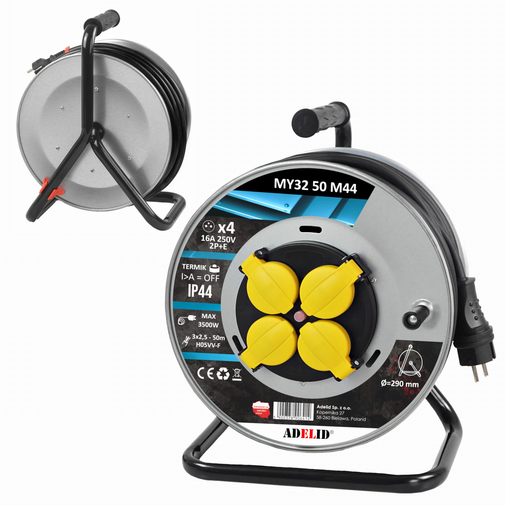 Do produkcji przedłużacza użyto wysokiej klasy materiałów: Kabel w polwinitowej izolacji ( H05VV-F), bęben metalowy M44 oraz wtyczkę gumową.