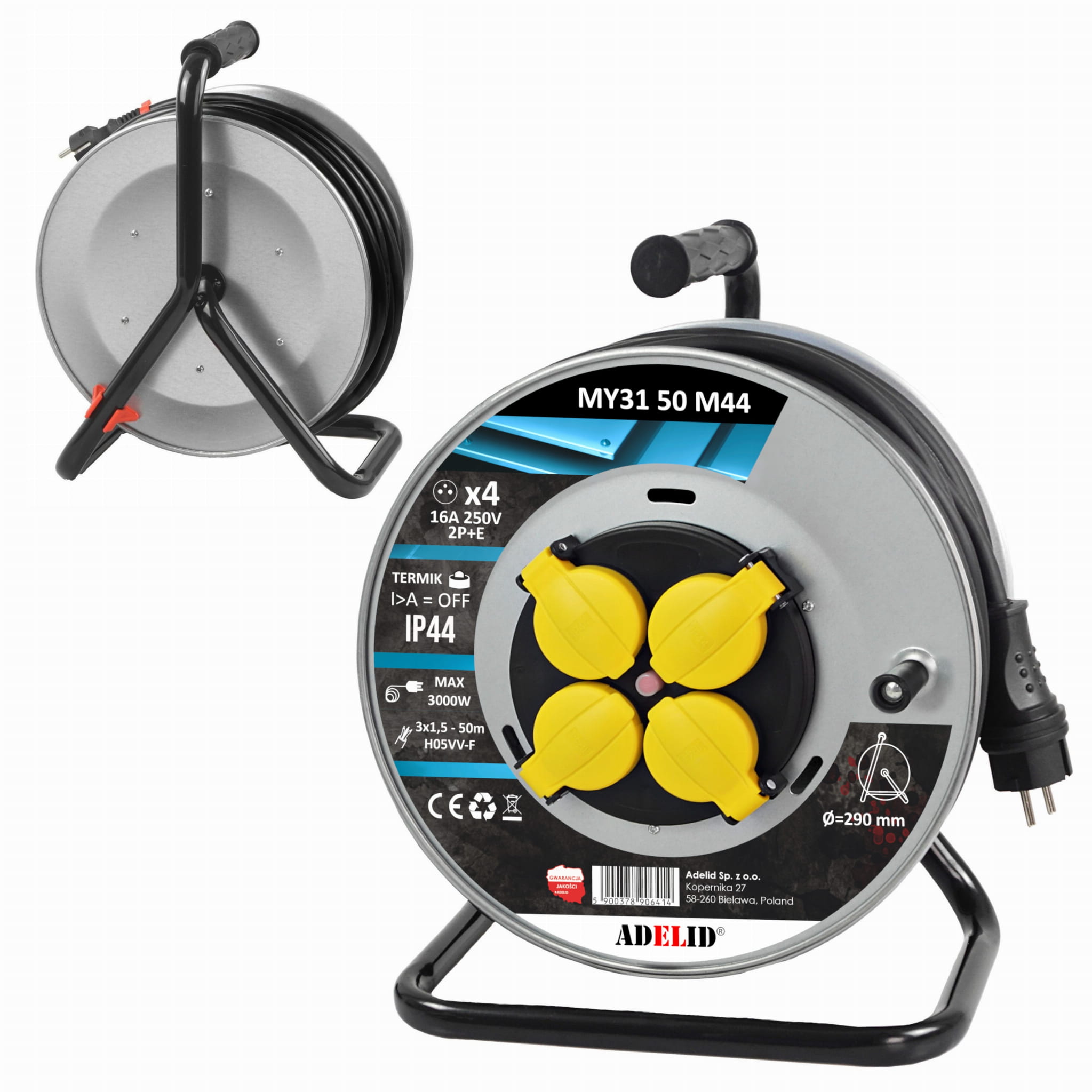 Do produkcji przedłużacza użyto wysokiej klasy materiałów: Kabel w polwinitowej izolacji ( H05VV-F), bęben metalowy M44 oraz wtyczkę gumową.