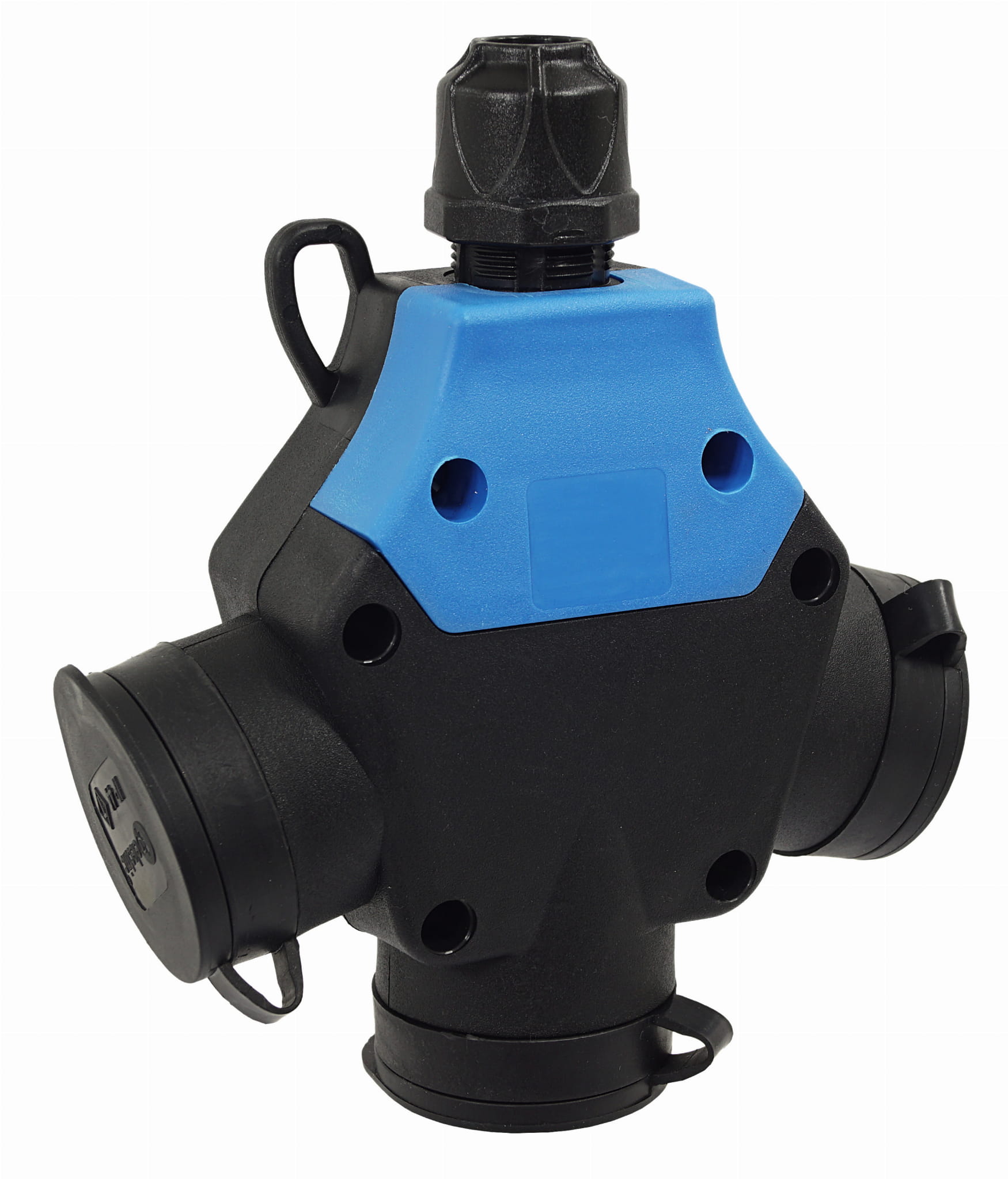 - Trójnik posiada trzy gniazda z klapkami, co zapewnia mu szczelność IP44. Gniazda z uziemieniem poprzez bolec.