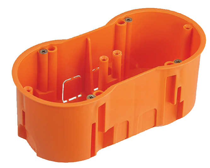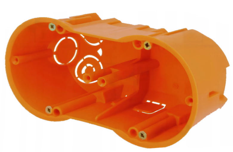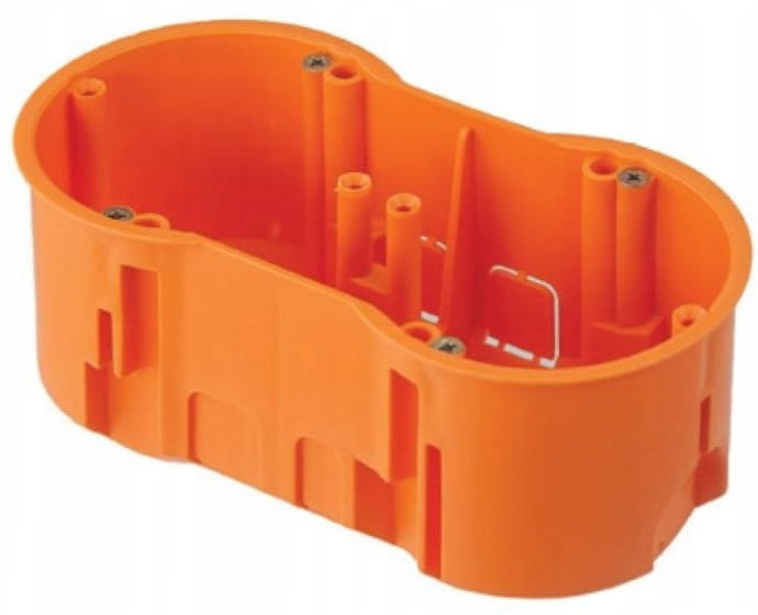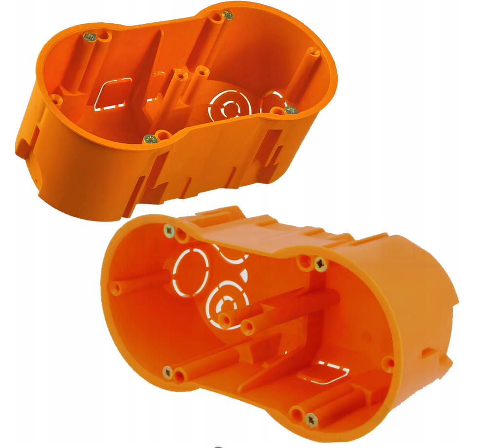 Puszka instalacyjna podtynkowa, głęboka, z wkrętami, przeznaczona do montażu podtynkowego, na dwa wkłady osprzętowe, zapewnia komfort instalacji w każdych warunkach.