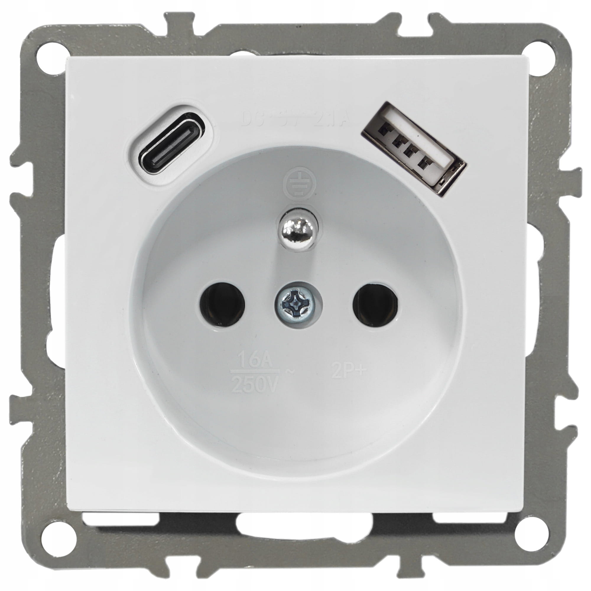 GNIAZDKO POJEDYNCZE Z UZIEMIENIEM, Z GNIAZDEM USB typu C I USB, BIAŁE, PODTYNKOWE, DO RAMKI.