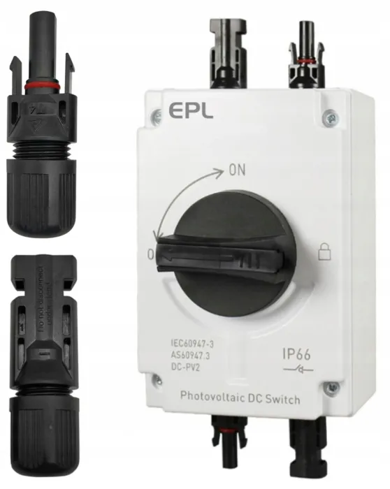 - Mechanizm działania zastosowany w rozłączniku to mechanizm krzywkowy ON/OFF. Rozłącznik znajduje się w obudowie z klasą ochrony IP65, dzięki czemu jest chroniony przed pyłami i strumieniami wody. Można go stosować na zewnątrz lub wewnątrz budynku, w instalacjach fotowoltaicznych.