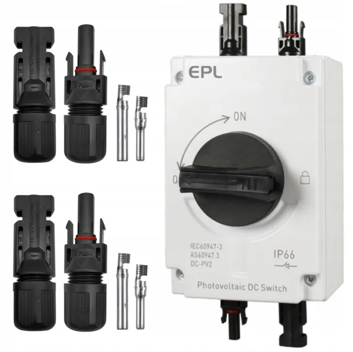 Rozłącznik izolacyjny główny w obudowie 1200V DC, 32A, dedykowany do sieci fotowoltaicznych + 2x zestaw konektorów złączy MC4.