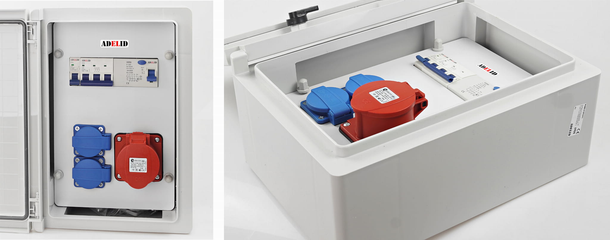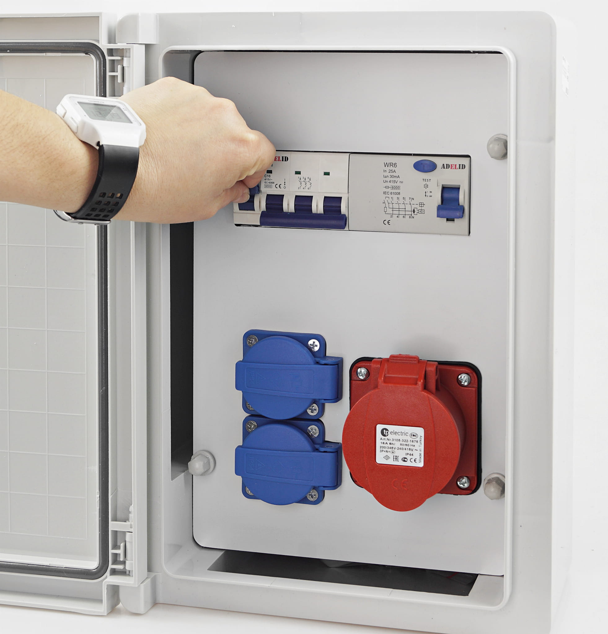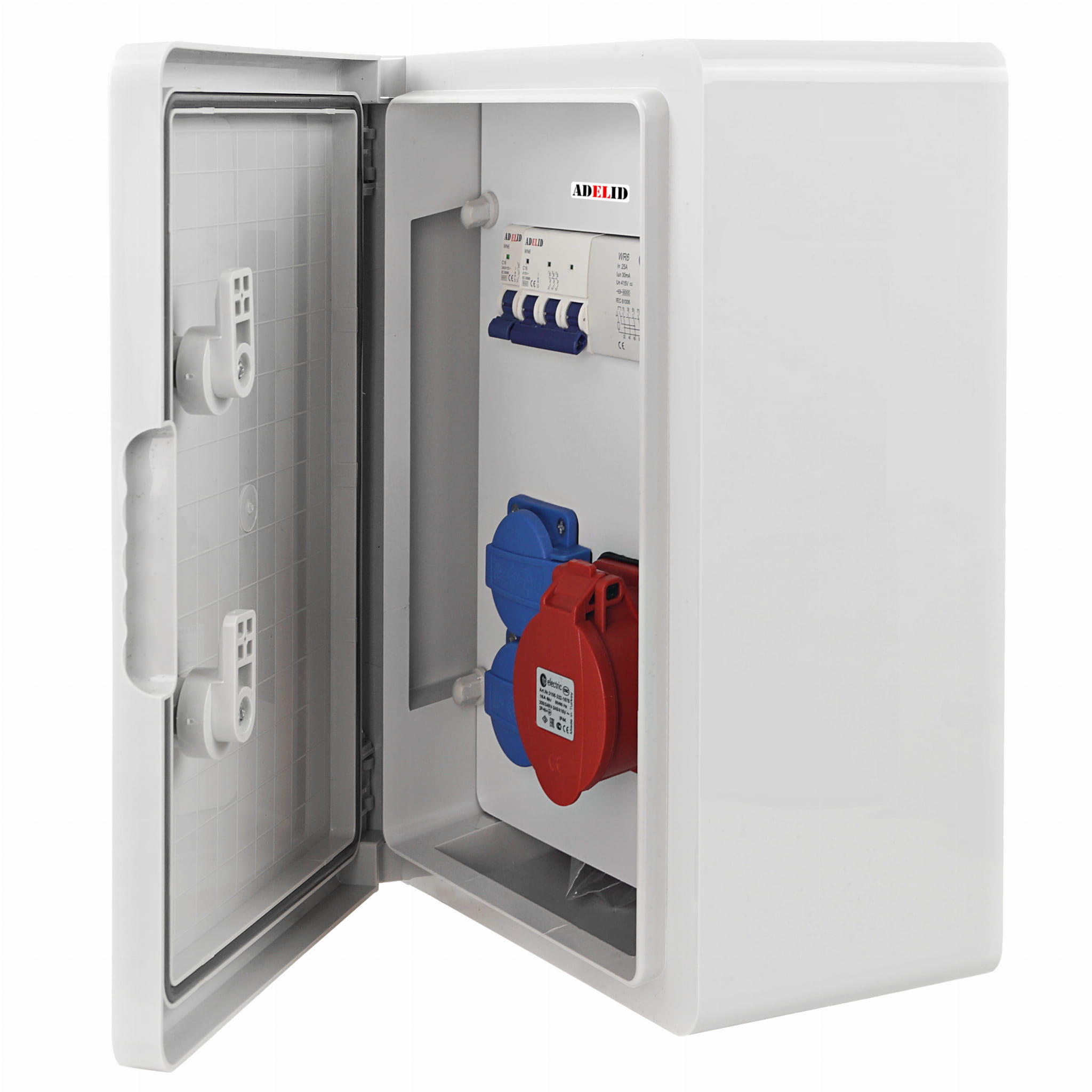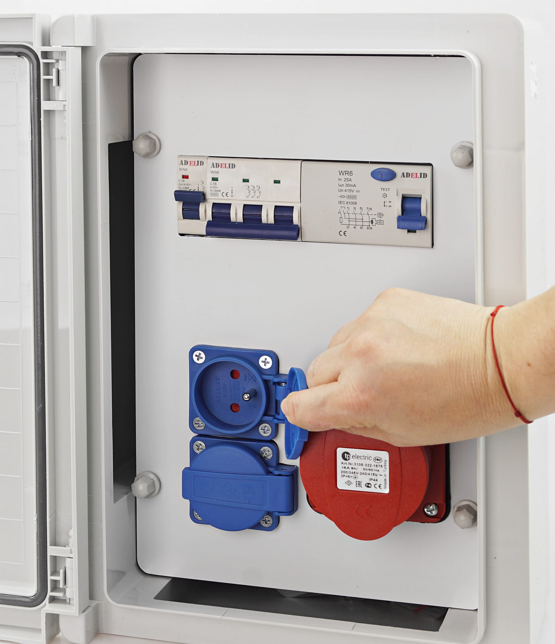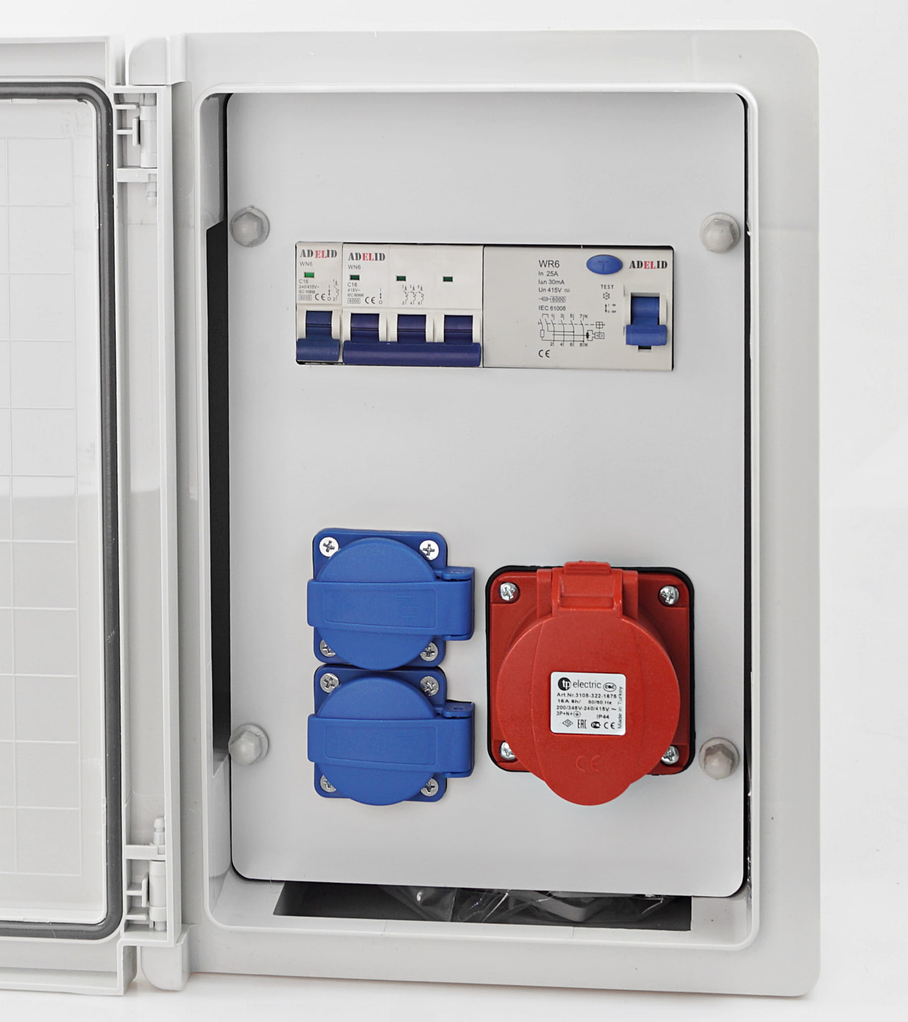 Prezentujemy Państwu rozdzielnicę budowlaną zamykaną, wyposażoną w 1 wyłącznik różnicowo-prądowy 25A 4P 0,03A, 1 gniazdo 16A 5P 400V oraz 2 gniazda 16A 3P 230V.