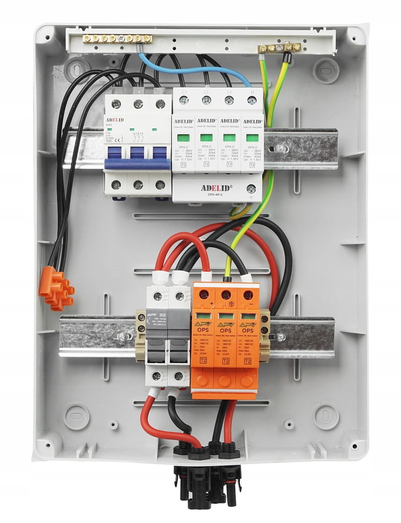 Zabezpieczenie instalacji PV przed przeciążeniami i skutkami zwarć w systemach fotowoltaicznych prądu stałego DC. W pełni okablowana, gotowa do podłączenia.
