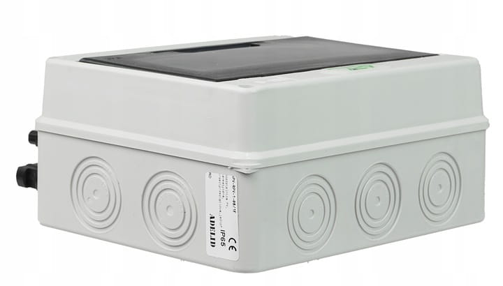 - Obudowa rozdzielnicy na 8 modułów, natynkowa, o szczelności IP65, z drzwiami transparentnymi.