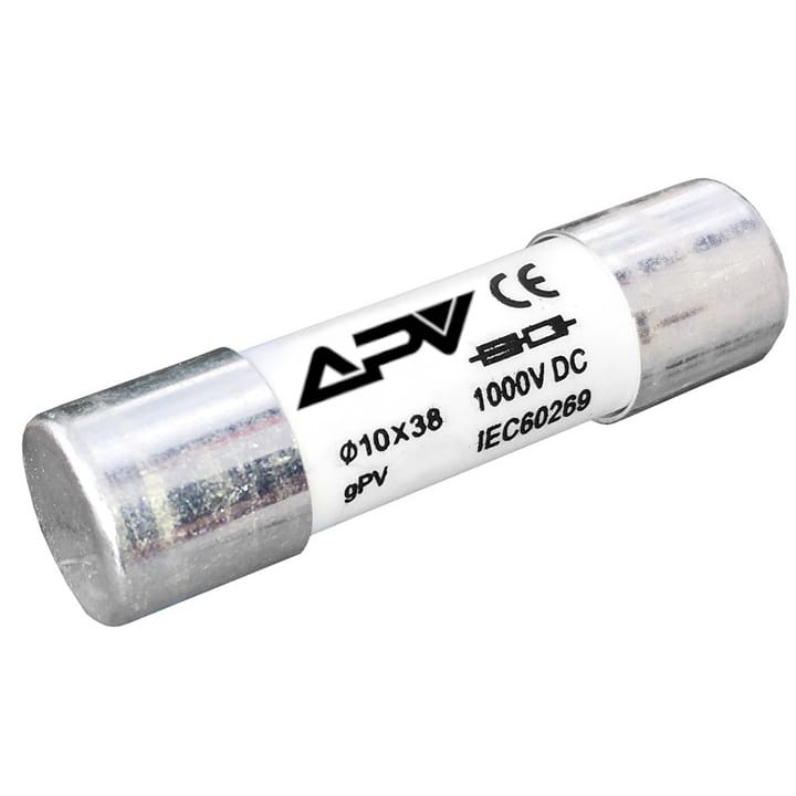 - Dwa rozłączniki bezpiecznikowe APV, 2P 10x38 1000V DC, w skład którego wchodzą: dwie podstawy bezpiecznikowe 2P oraz cztery wkładki rurkowe gPV 15A.