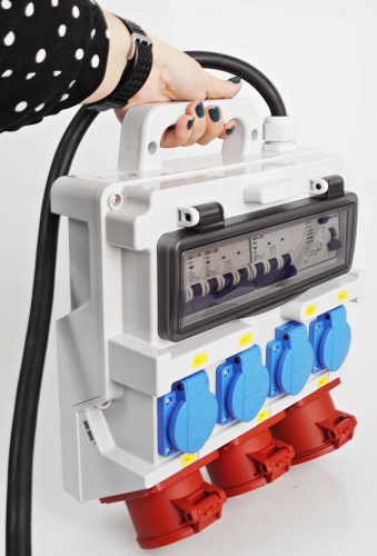 RPD - Rozdzielnice przenośne z okienkiem 12 modułowym - maksymalnie 3 gniazda siłowe i 4 gniazda 230V. Rozdzielnice z rączką do pracy w terenie - zabezpieczone, gotowe do podłączenia w dowolnym miejscu pod gniazdo siłowe. Dostępne wersje z zabezpieczeniami, występują opcje z licznikami.