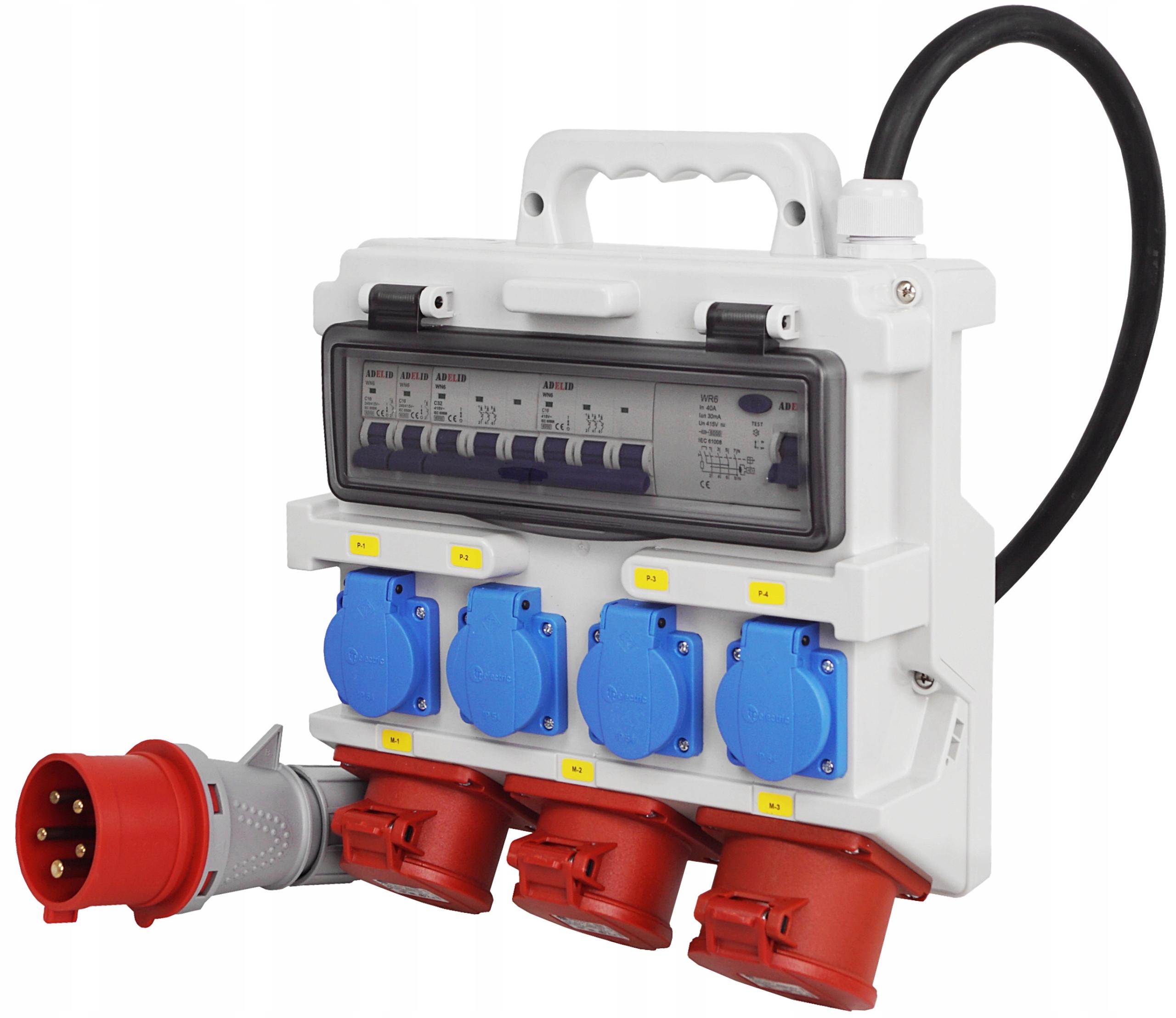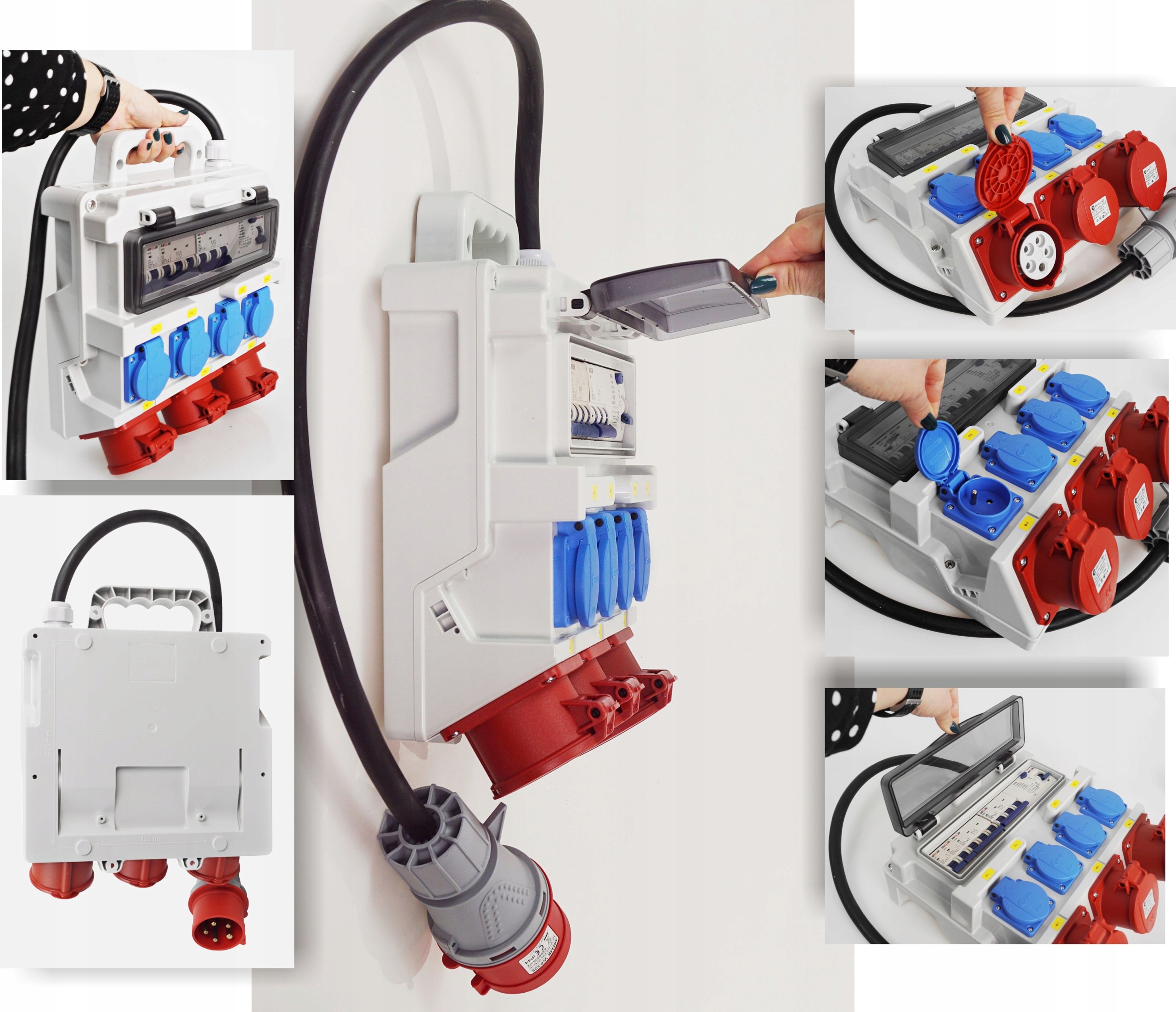 ORYGINALNA RODZIELNICA ELEKTRYCZNA, ZABEZPIECZONA, MARKI ADELID, Z TRZEMA GNIAZDAMI SIŁOWYMI 5 POLOWYMI, CZTEREMA GNIAZDAMI 230V ORAZ DODATKOWĄ WTYCZKĄ SIŁOWĄ, ZASILAJACĄ 32A.