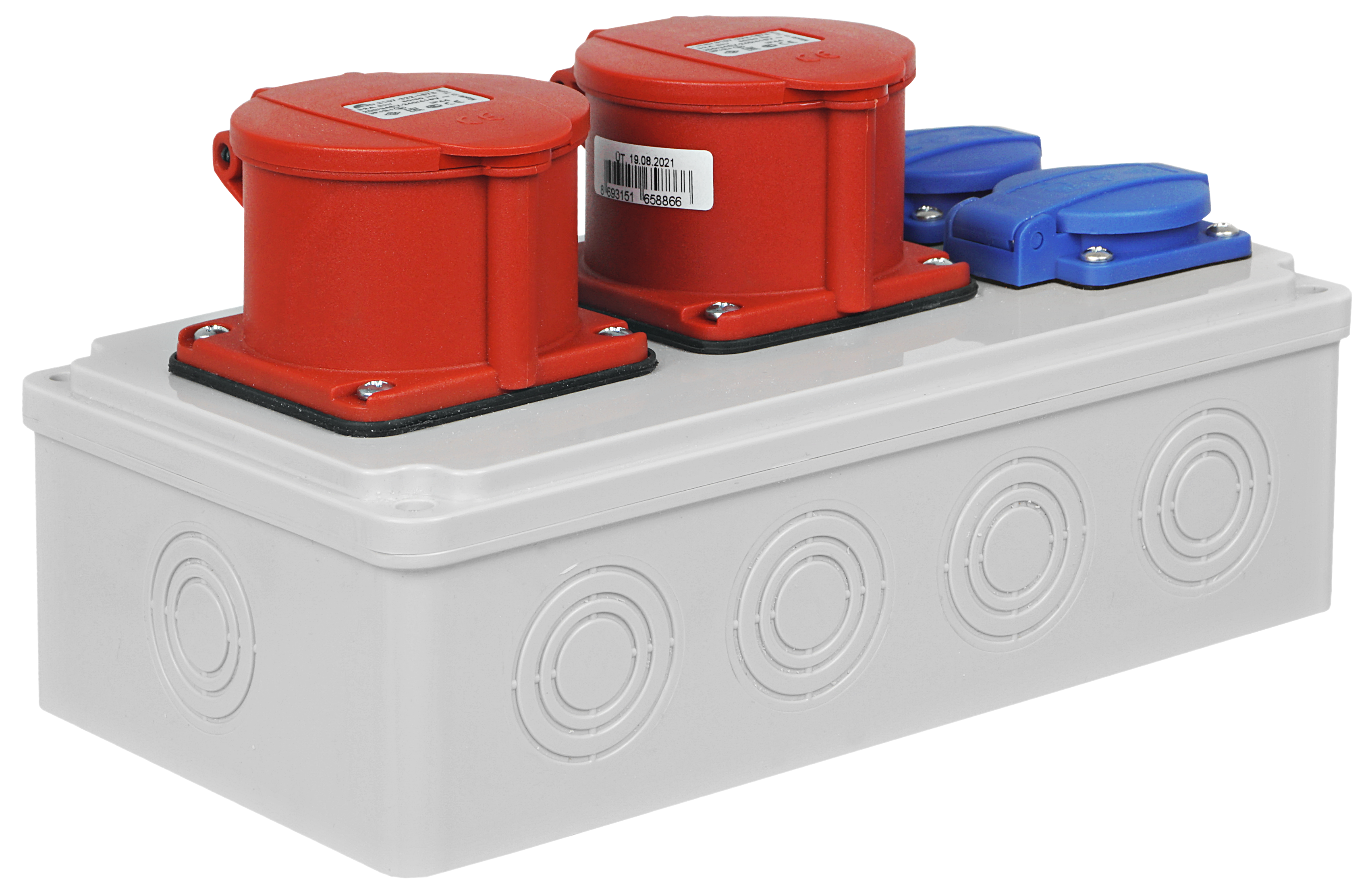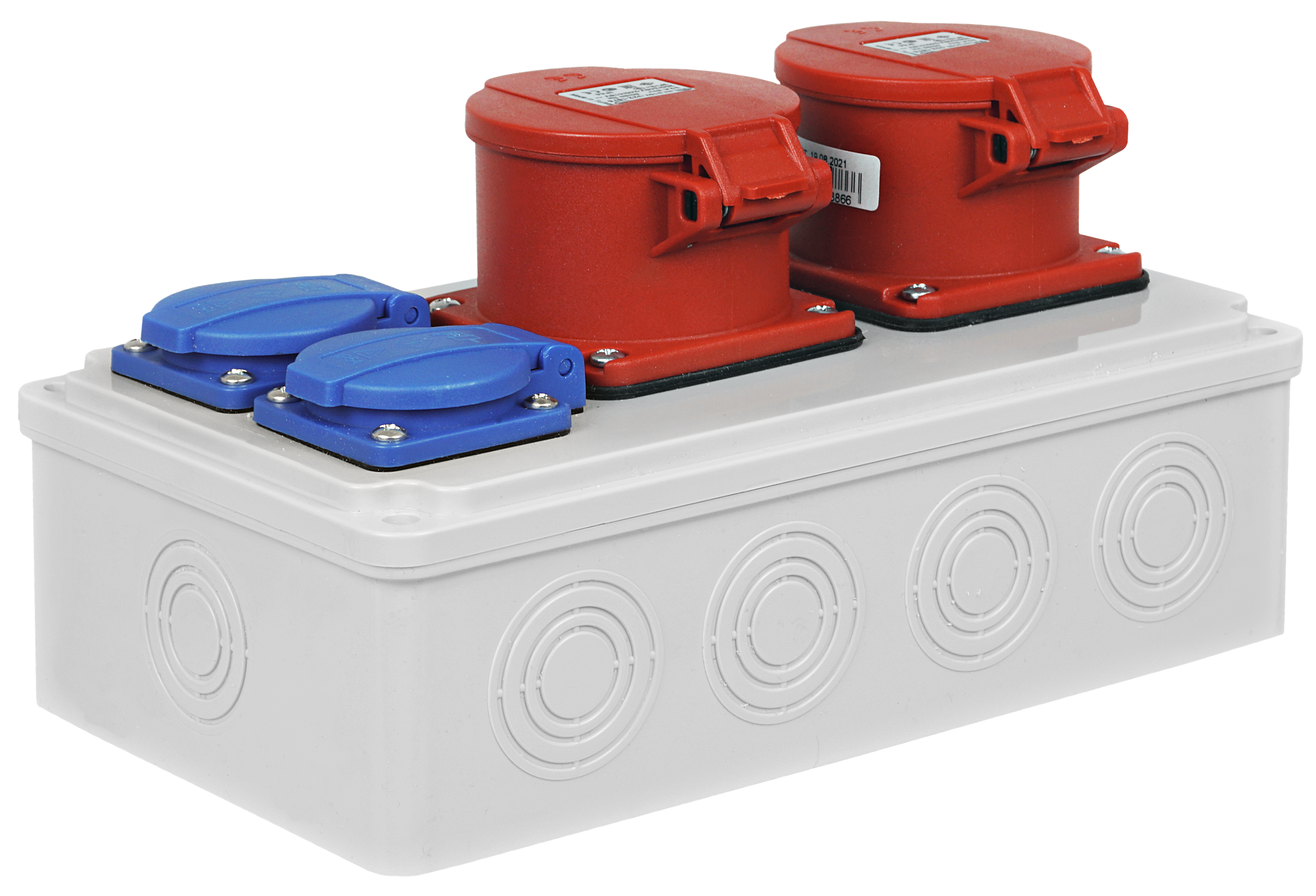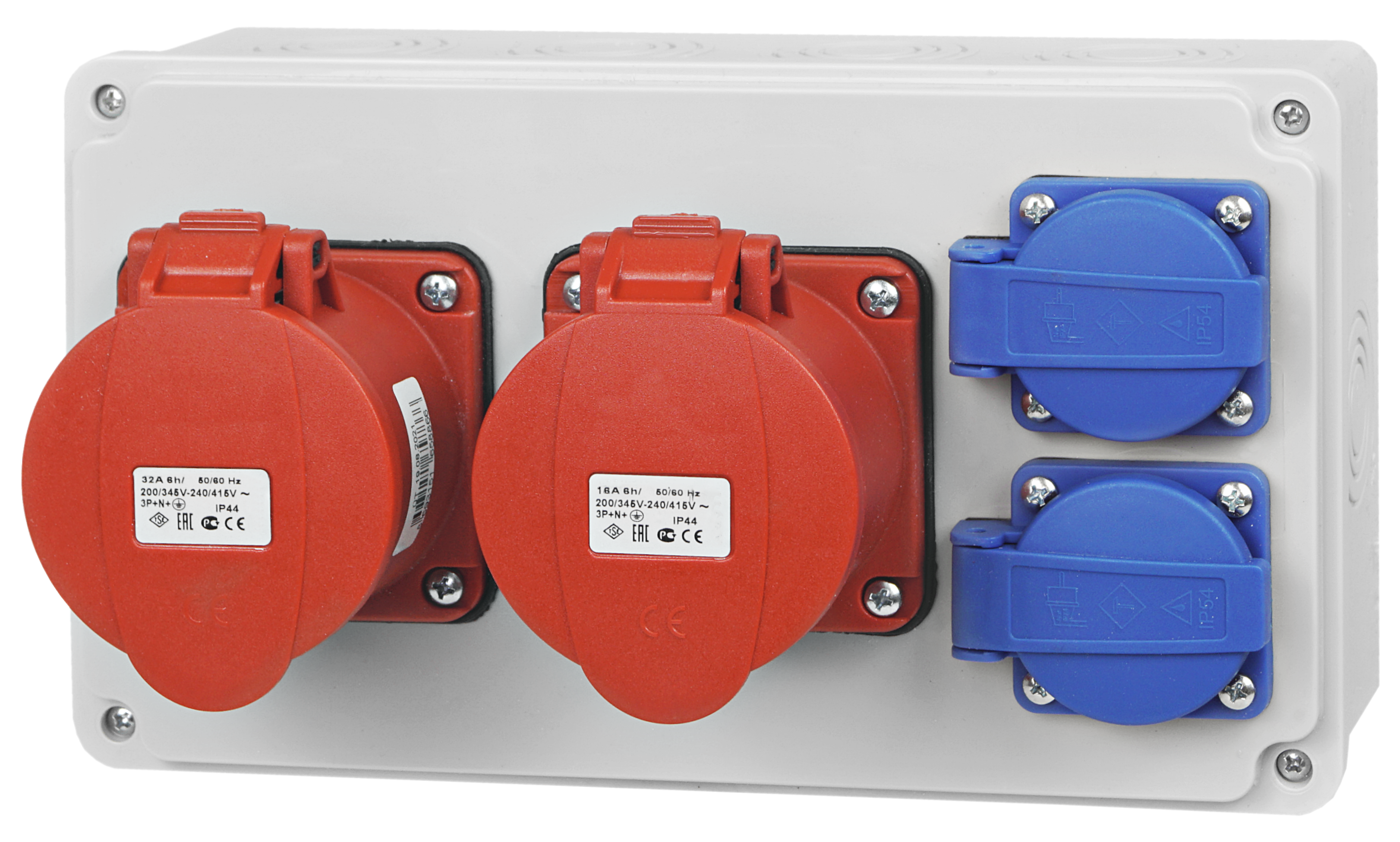 ORYGINALNA RODZIELNICA ELEKTRYCZNA, ZABEZPIECZONA, MARKI ADELID. NATYNKOWA Z GNIAZDAMI SIŁOWYMI 32A I 16A 4-POLOWYMI, DWOMA GNIAZDAMI 230V.