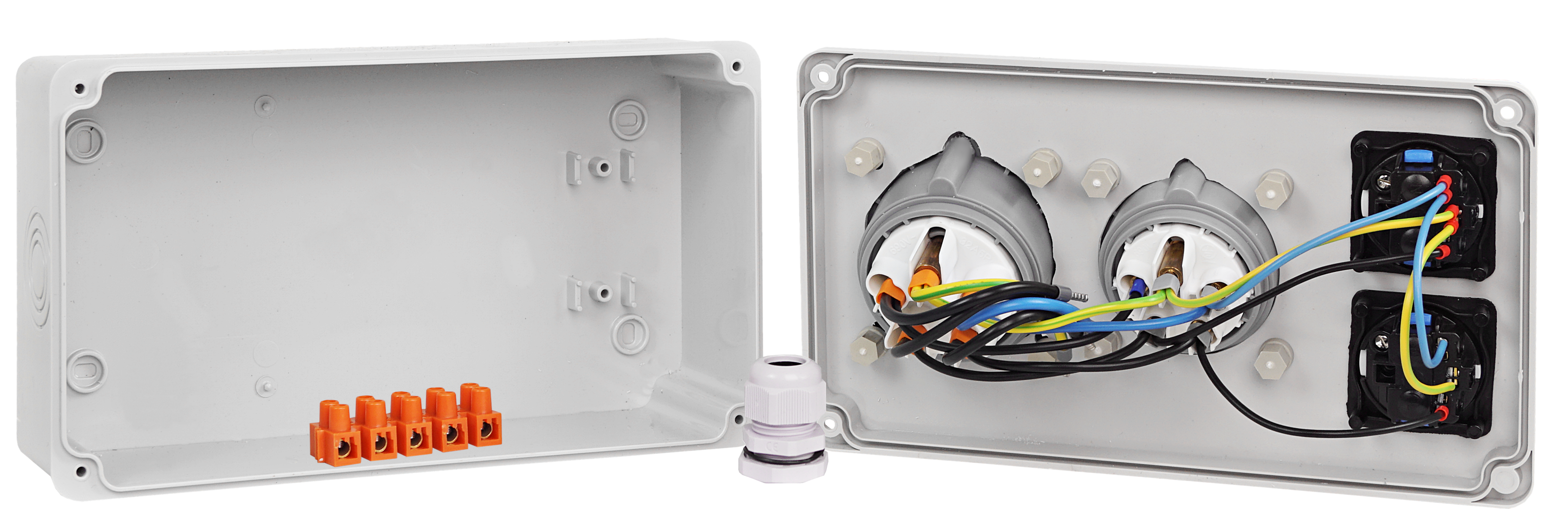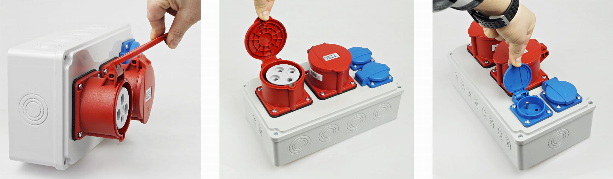 Gniazda jednofazowe 230V, posiadają klapki, dzięki czemu ich szczelność jest na poziomie IP54.