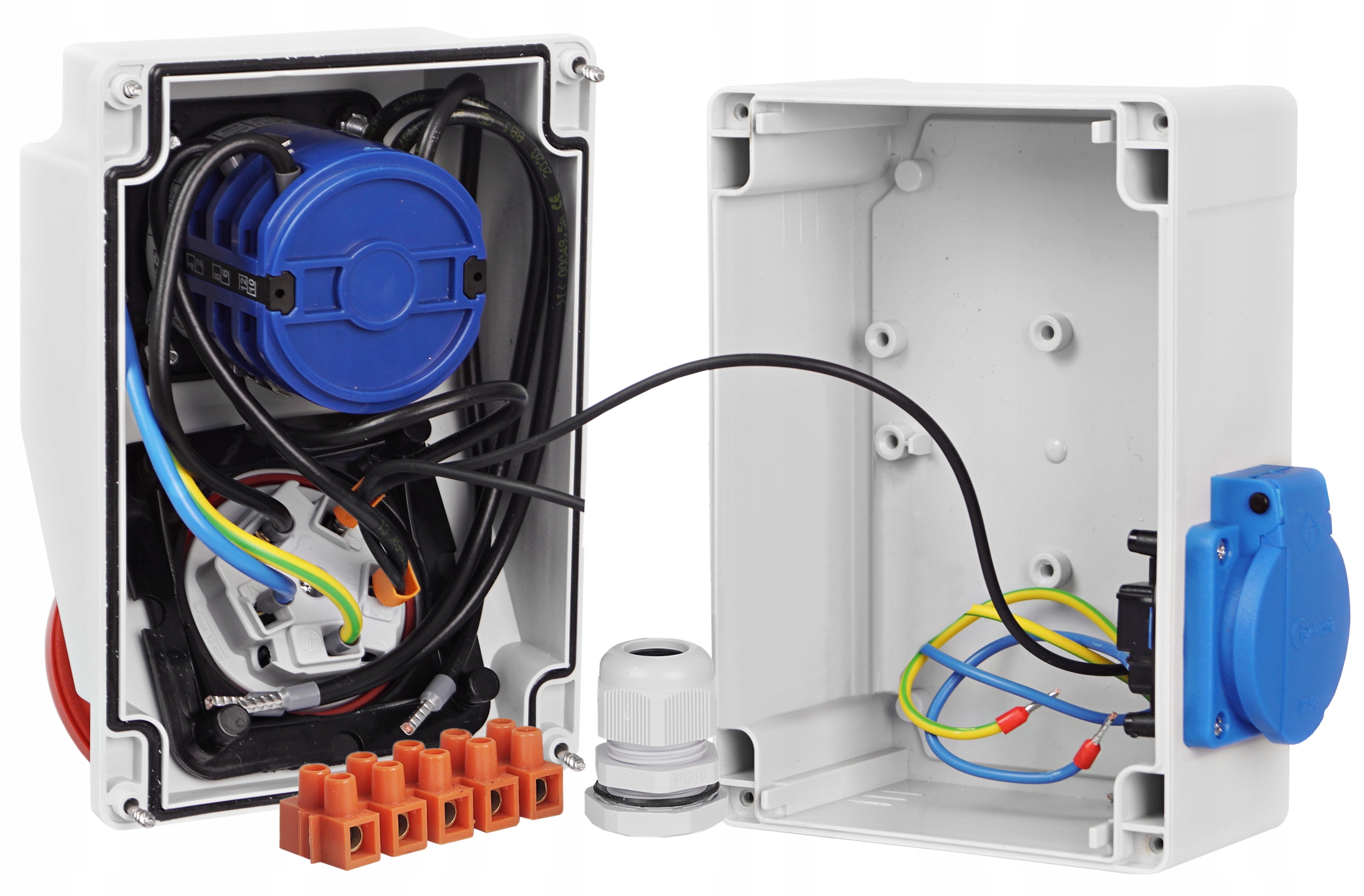 Gniazdo 230V posiada klapkę, zapewniając szczelność na poziomie IP54.