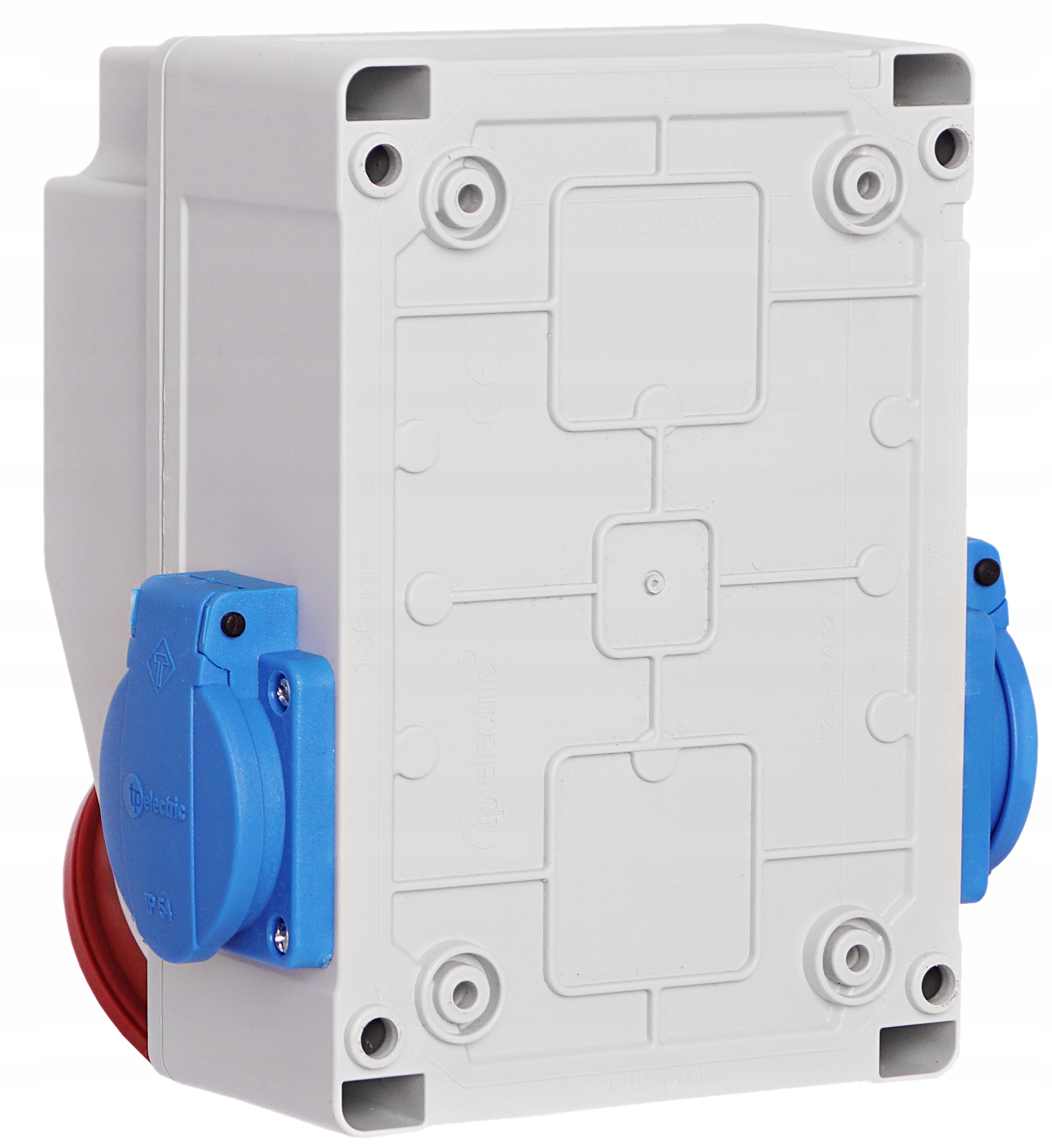Gniazda 230V posiadają klapki, zapewniające szczelność na poziomie IP54.