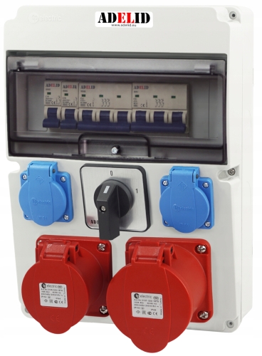 ORYGINALNA RODZIELNICA ELEKTRYCZNA, ZABEZPIECZONA, MARKI ADELID, Z GNIAZDAMI SIŁOWYMI 32A 4-POLOWYMI, DWOMA GNIAZDAMI 230V ORAZ WŁĄCZNIKIEM 0-1.