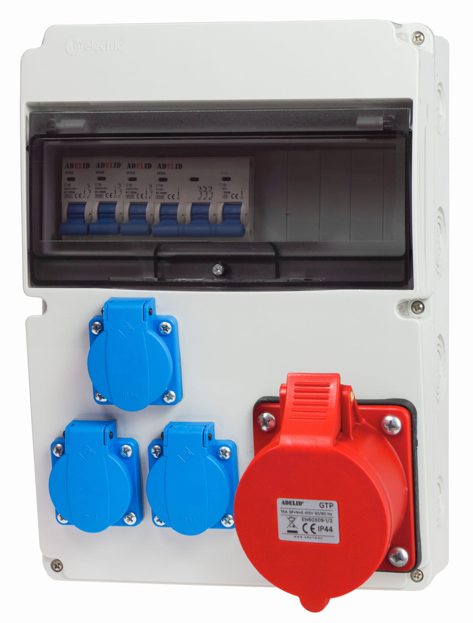 ORYGINALNA RODZIELNICA ELEKTRYCZNA, MARKI ADELID, Z GNIAZDEM SIŁOWYM 16A ORAZ TRZEMA GNIAZDAMI 230V.
