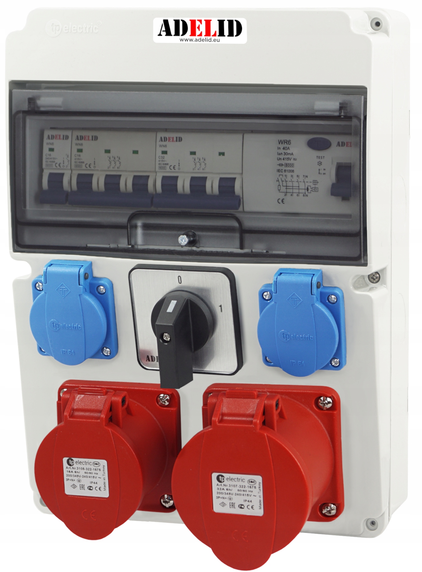 ORYGINALNA RODZIELNICA ELEKTRYCZNA, ZABEZPIECZONA, MARKI ADELID, Z GNIAZDAMI SIŁOWYMI, GNIAZDAMI 230V ORAZ WŁĄCZNIKIEM 0-1.