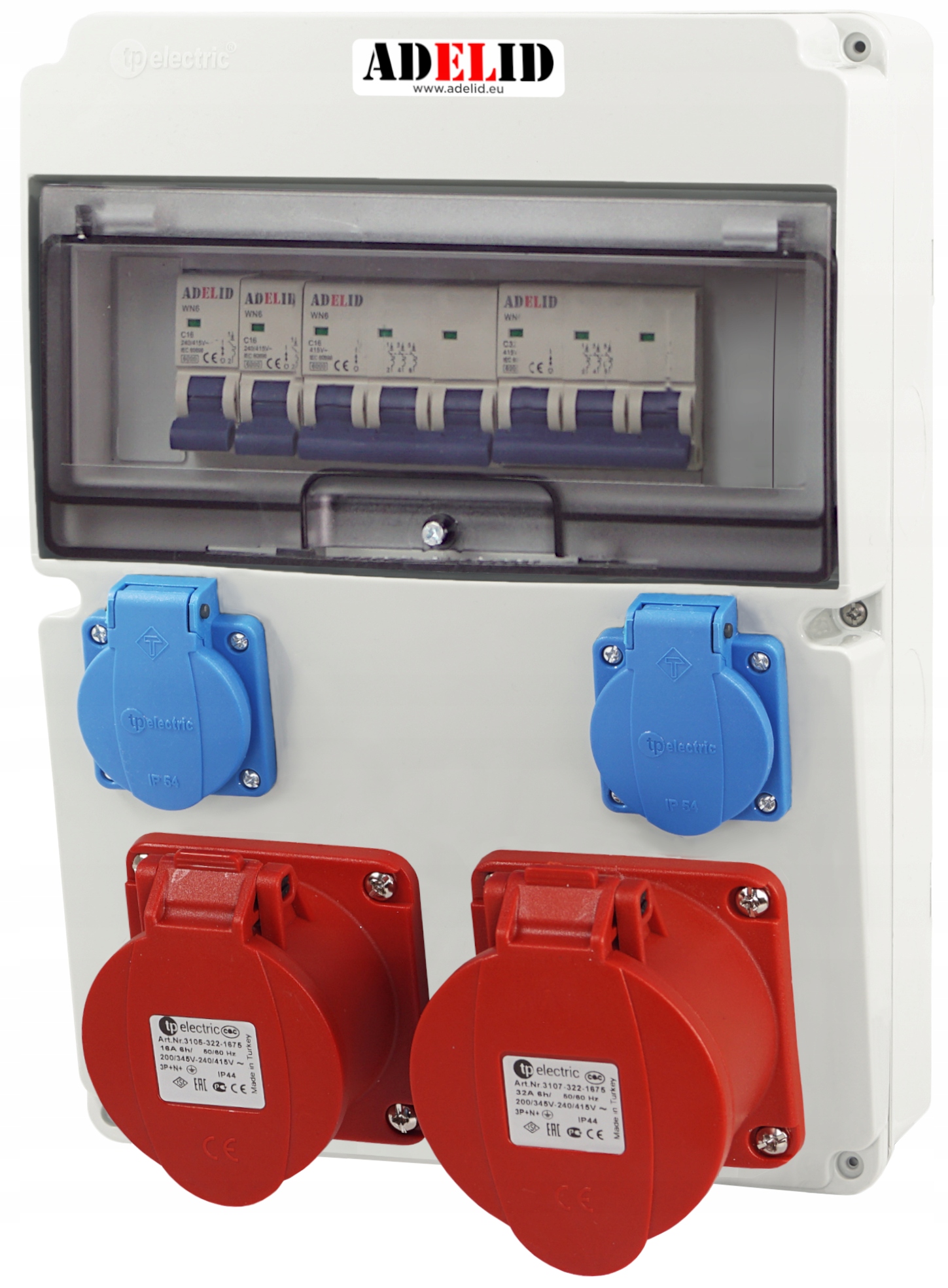 ORYGINALNA RODZIELNICA ELEKTRYCZNA, ZABEZPIECZONA, MARKI ADELID, Z GNIAZDAMI SIŁOWYMI ORAZ DWOMA GNIAZDAMI 230V.