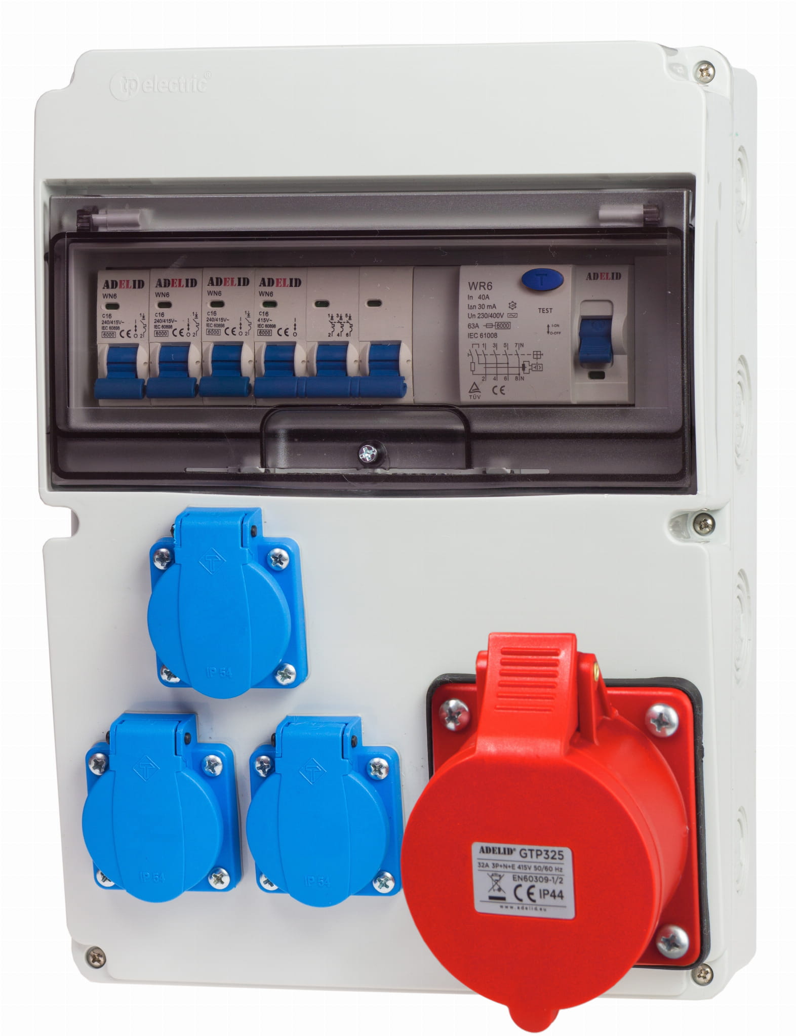 ORYGINALNA RODZIELNICA ELEKTRYCZNA, MARKI ADELID, Z WYŁĄCZNIKIEM RÓŻNICOWYM, GNIAZDEM SIŁOWYM 32A ORAZ TRZEMA GNIAZDAMI 230V.
