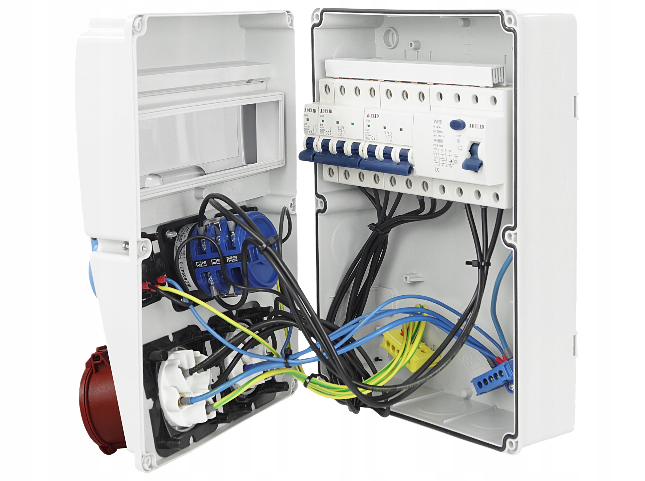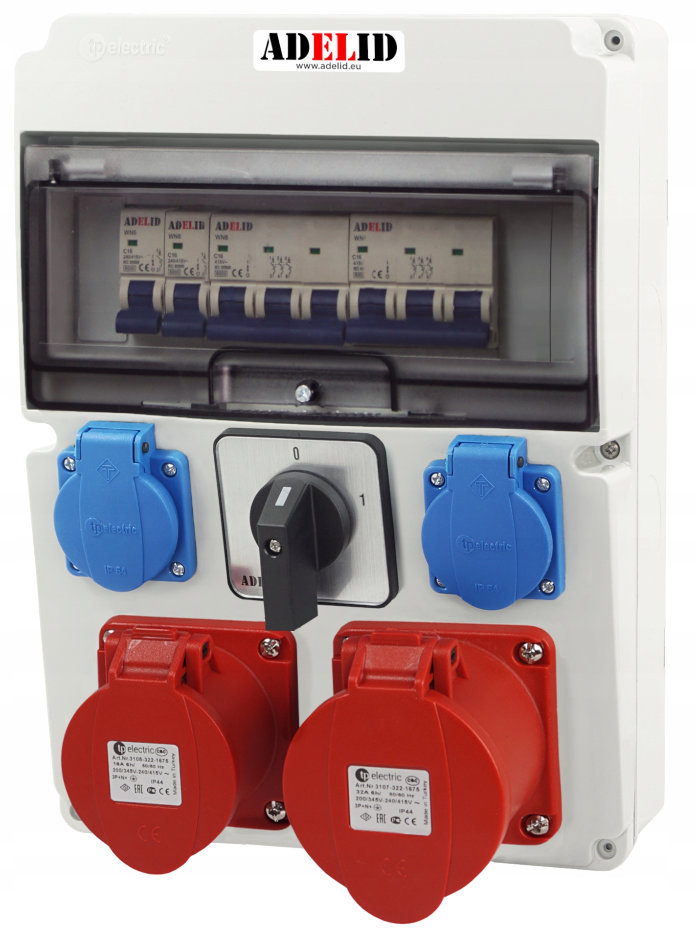 ORYGINALNA RODZIELNICA ELEKTRYCZNA, ZABEZPIECZONA, MARKI ADELID, Z GNIAZDAMI SIŁOWYMI 16A 4-POLOWYMI, DWOMA GNIAZDAMI 230V ORAZ WŁĄCZNIKIEM 0-1.