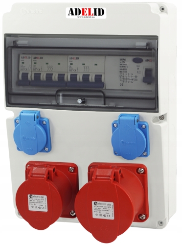 ORYGINALNA RODZIELNICA ELEKTRYCZNA, ZABEZPIECZONA, MARKI ADELID, Z DWOMA GNIAZDAMI SIŁOWYMI 16A ORAZ DWOMA GNIAZDAMI 230V.