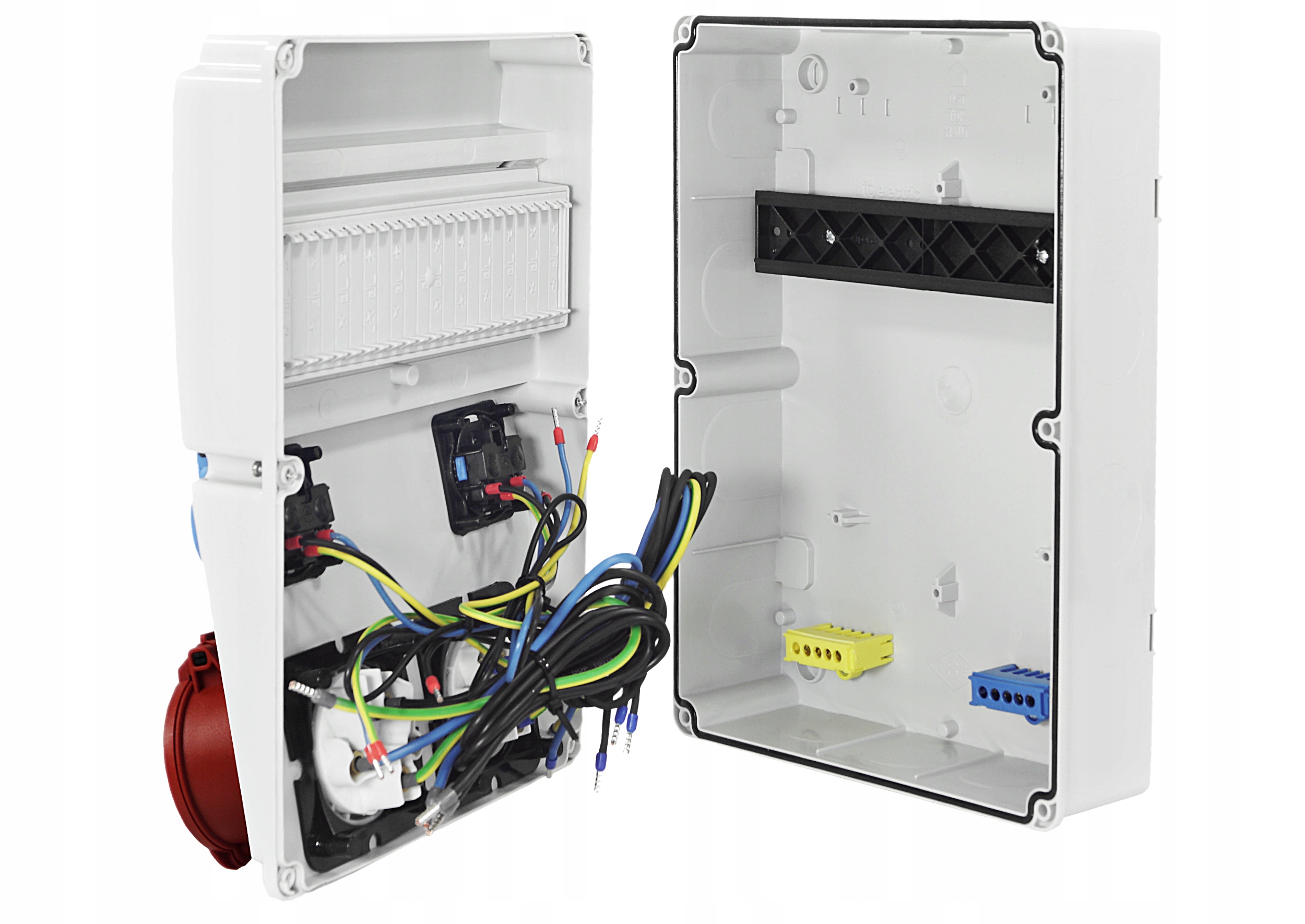 Rozdzielnica posiada pełne okablowanie gniazd, gotowa do podłączenia bezpieczników a następnie zasilania.