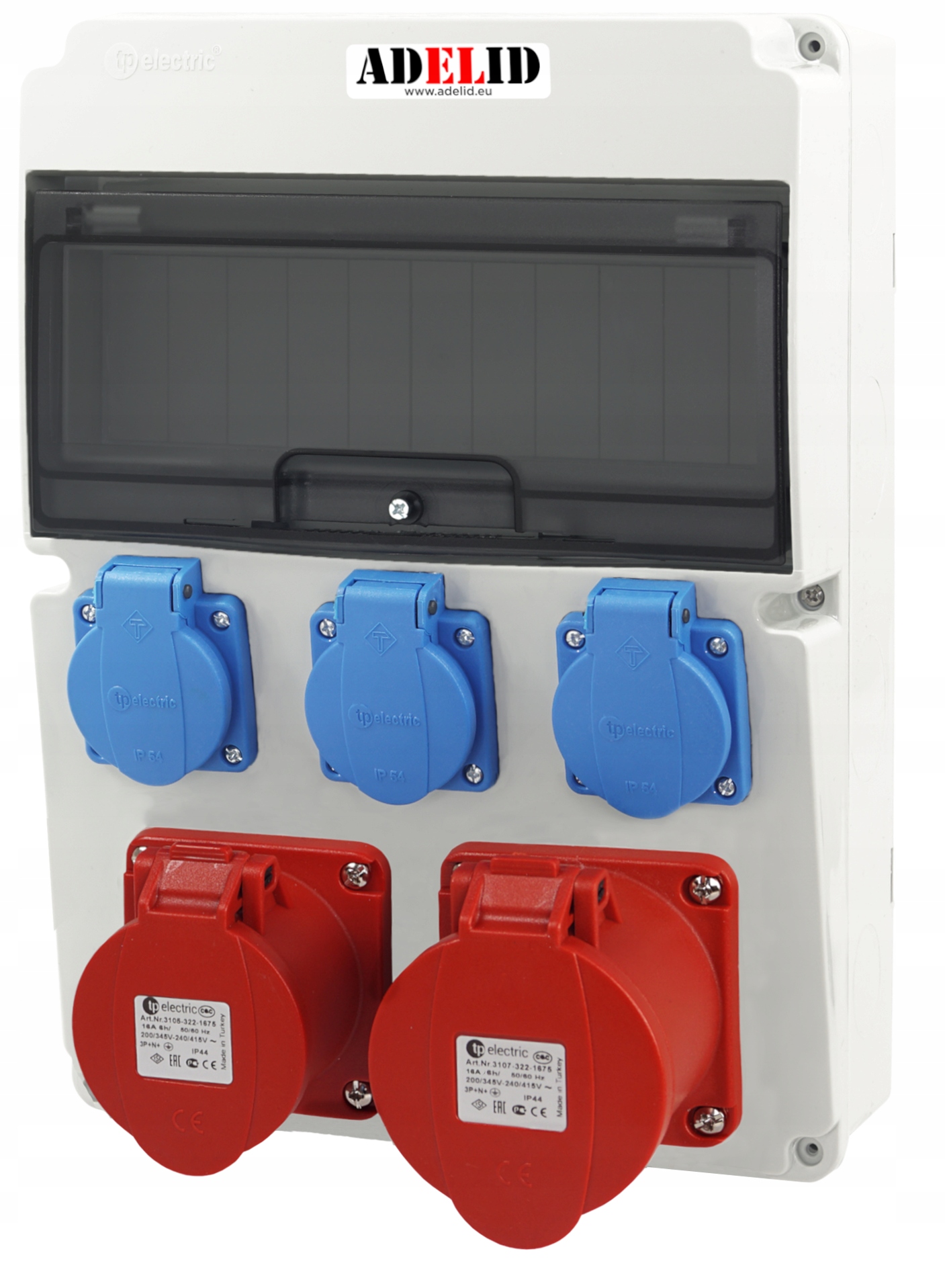 ORYGINALNA RODZIELNICA ELEKTRYCZNA, MARKI ADELID, Z DWOMA GNIAZDAMI SIŁOWYMI 16A ORAZ TRZEMA GNIAZDAMI 230V.