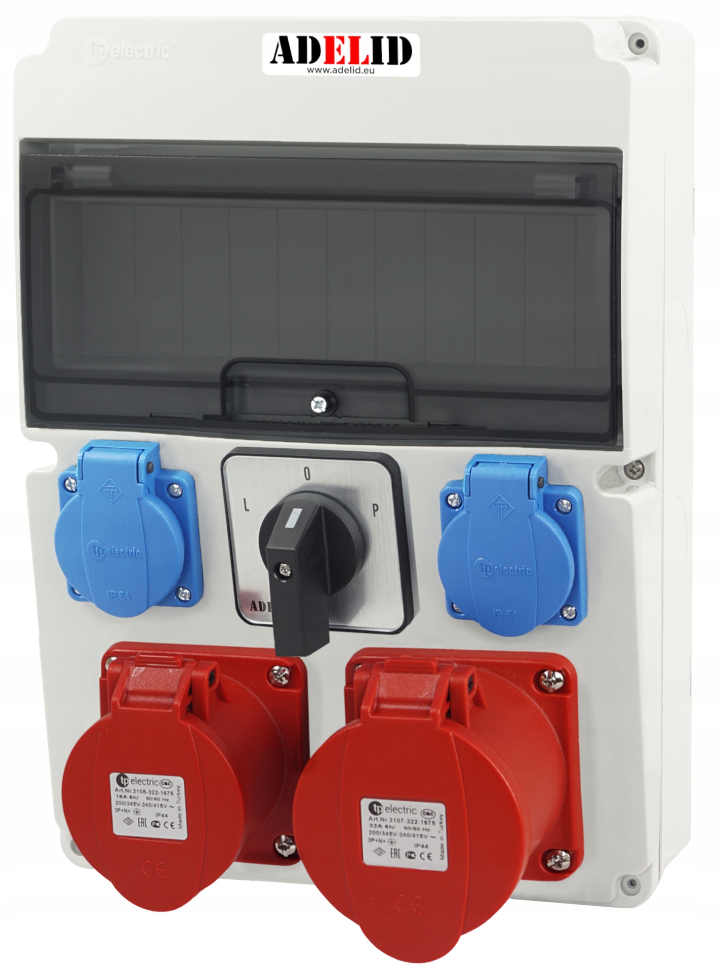 ORYGINALNA ROZDZIELNICA - SKRZYNKA ELEKTRYCZNA, NATYNKOWA ADELID, Z GNIAZDAMI SIŁOWYMI 32A 4-POLOWYMI, WYŁĄCZNIKIEM L0P ORAZ DWOMA GNIAZDAMI 230V.