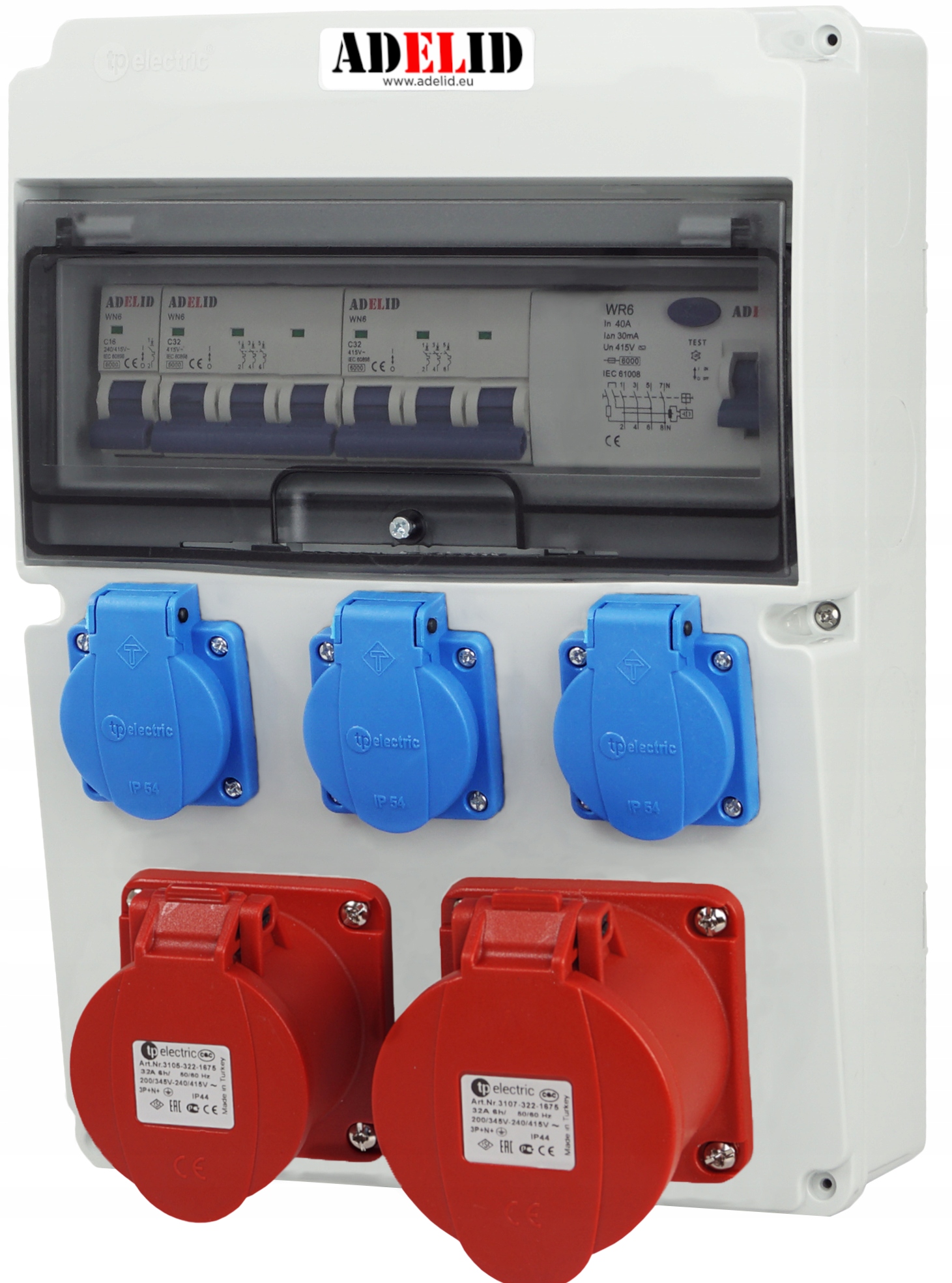 ORYGINALNA RODZIELNICA ELEKTRYCZNA, ZABEZPIECZONA, MARKI ADELID, Z DWOMA GNIAZDAMI SIŁOWYMI 32A ORAZ TRZEMA GNIAZDAMI 230V.