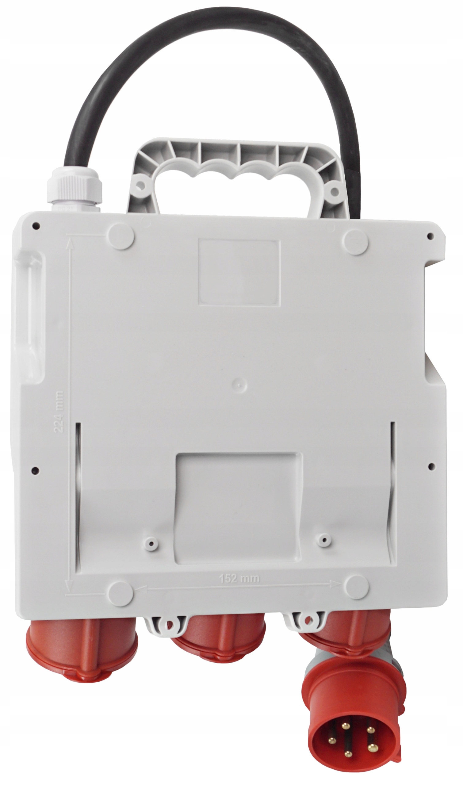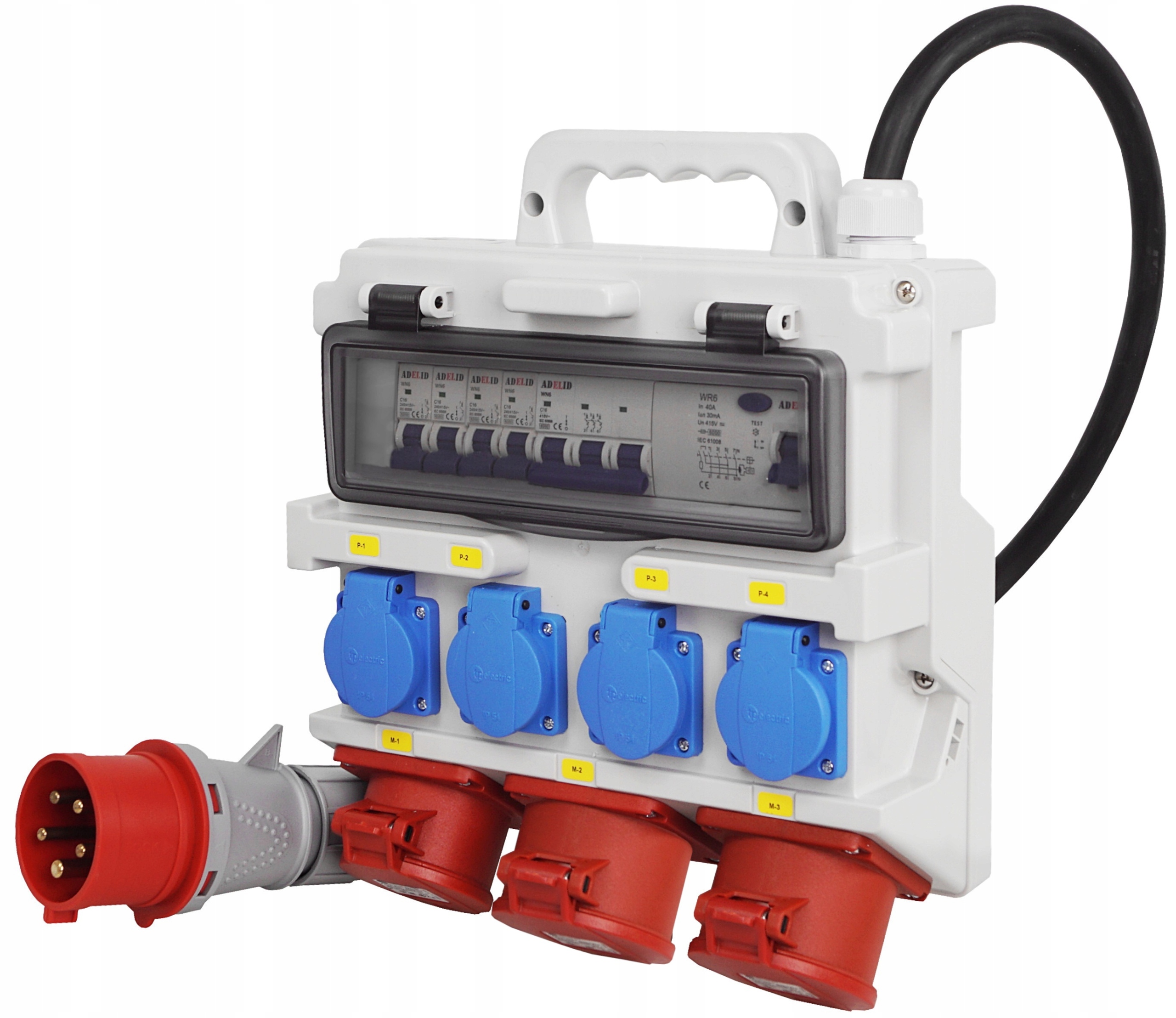ORYGINALNA RODZIELNICA ELEKTRYCZNA, ZABEZPIECZONA, MARKI ADELID, Z TRZEMA GNIAZDAMI SIŁOWYMI 5 POLOWYMI, CZTEREMA GNIAZDAMI 230V ORAZ DODATKOWĄ WTYCZKĄ SIŁOWĄ, ZASILAJACĄ 32A.