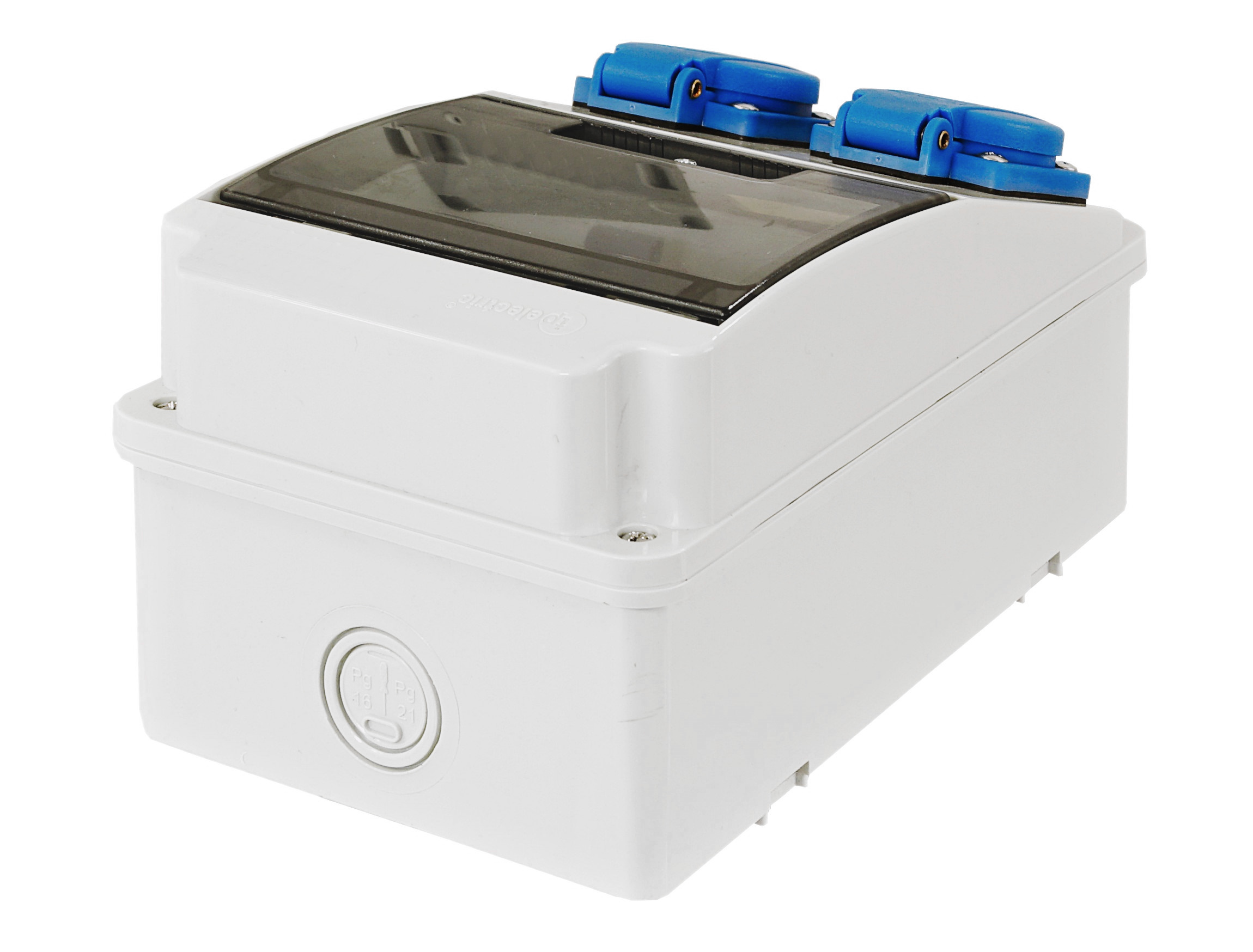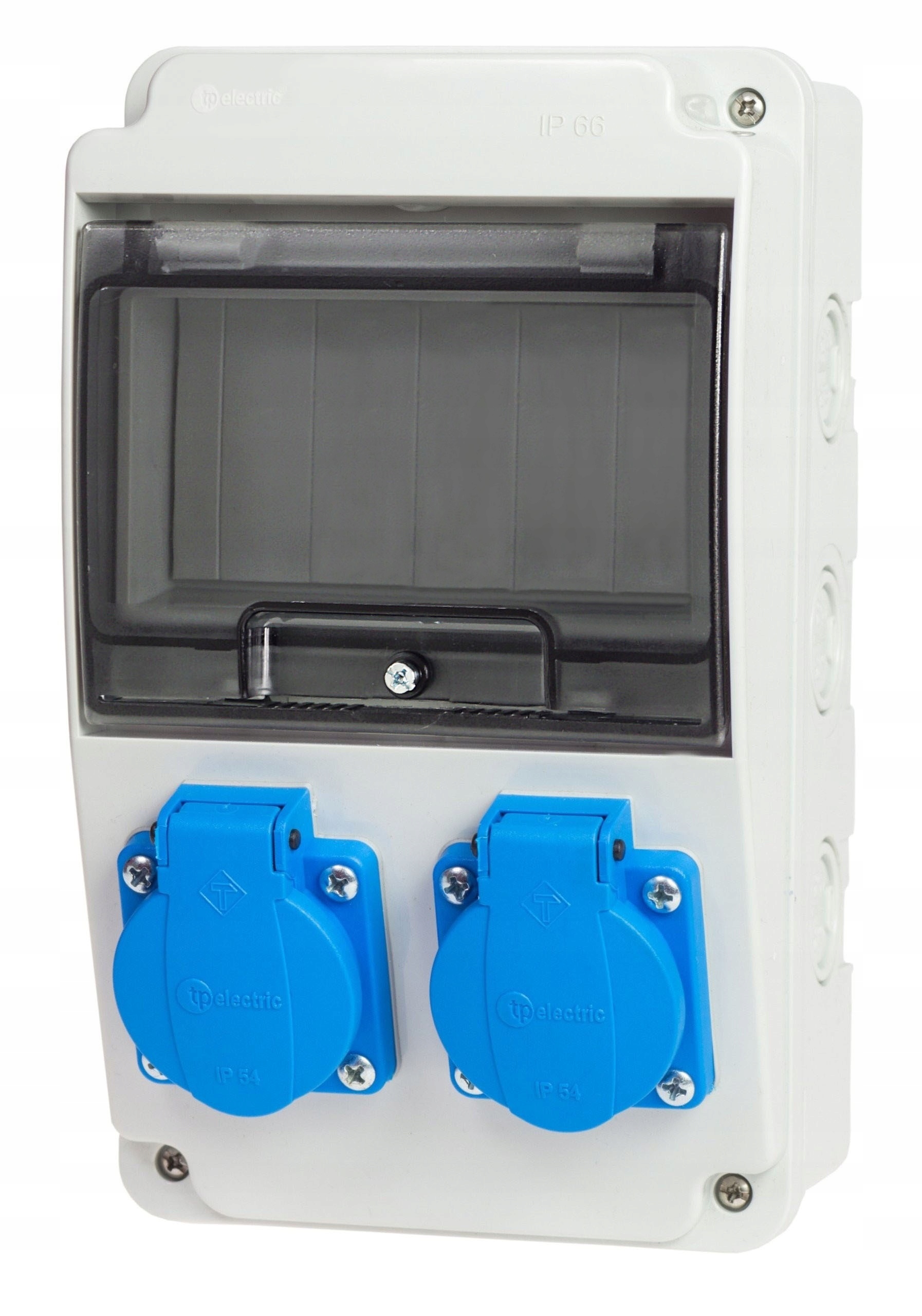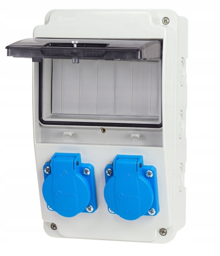 Gniazda 230V posiadają klapki, zapewniające szczelność na poziomie IP54, co wpływa bezpośrednio na BEZPIECZEŃSTWO użytkowania rozdzielnicy.