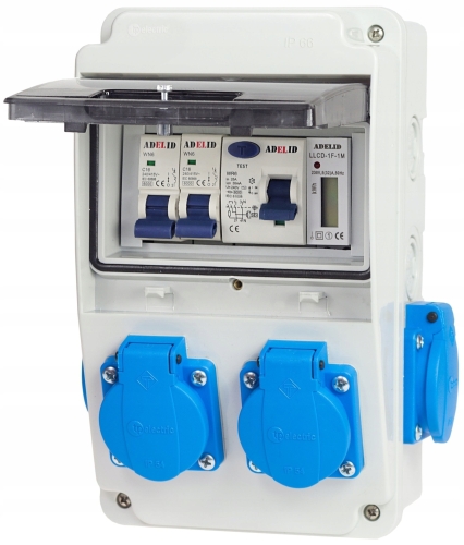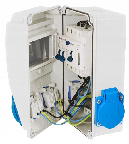 Gniazda 230V posiadają klapki, zapewniające szczelność na poziomie IP54, co wpływa bezpośrednio na BEZPIECZEŃSTWO użytkowania rozdzielnicy.