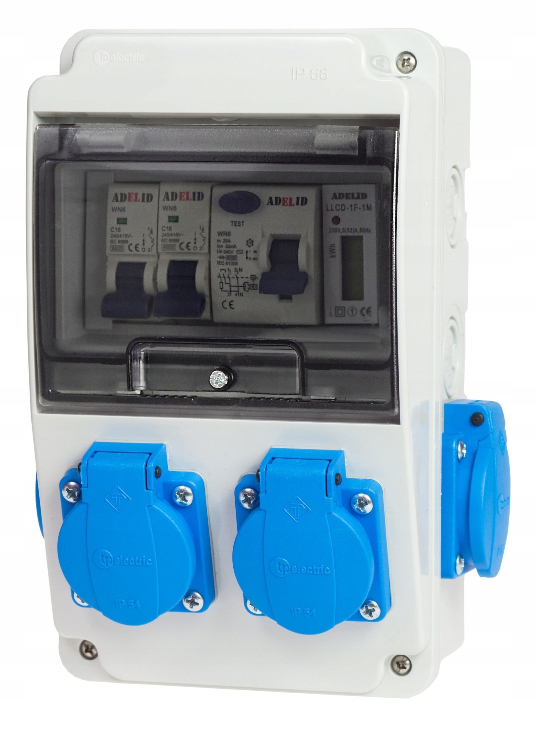 ORYGINALNA RODZIELNICA ELEKTRYCZNA, ZABEZPIECZONA, MARKI ADELID, Z LICZNIKIEM ENERGII 1- FAZOWYM ORAZ CZTEREMA GNIAZDAMI 230V.