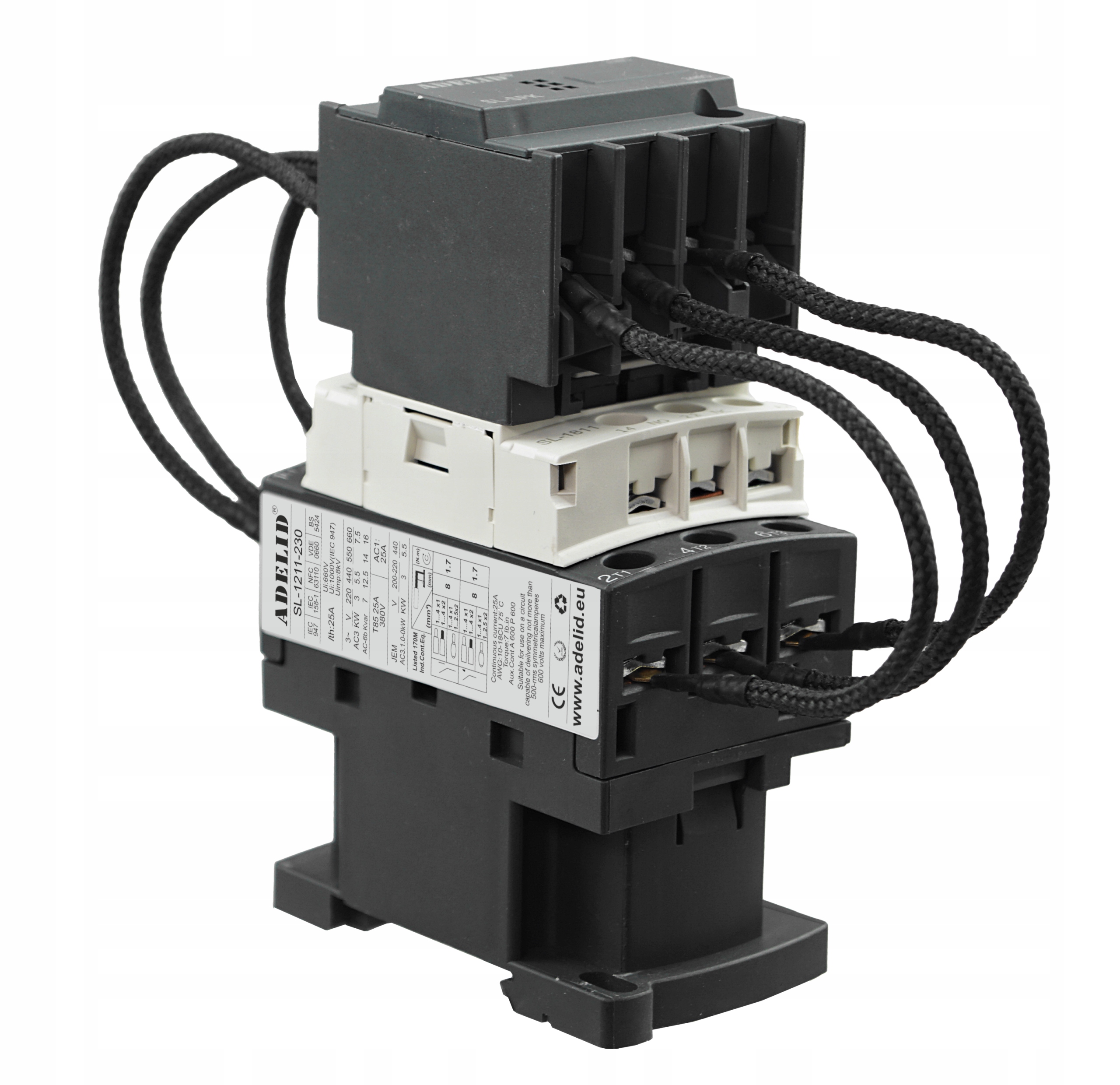 Stycznik marki Adelid to 3-biegunowy stycznik serii SL-SPK do załączania kondensatorów o mocy biernej do 12.5Kvar i prądzie znamionowym do 12A.