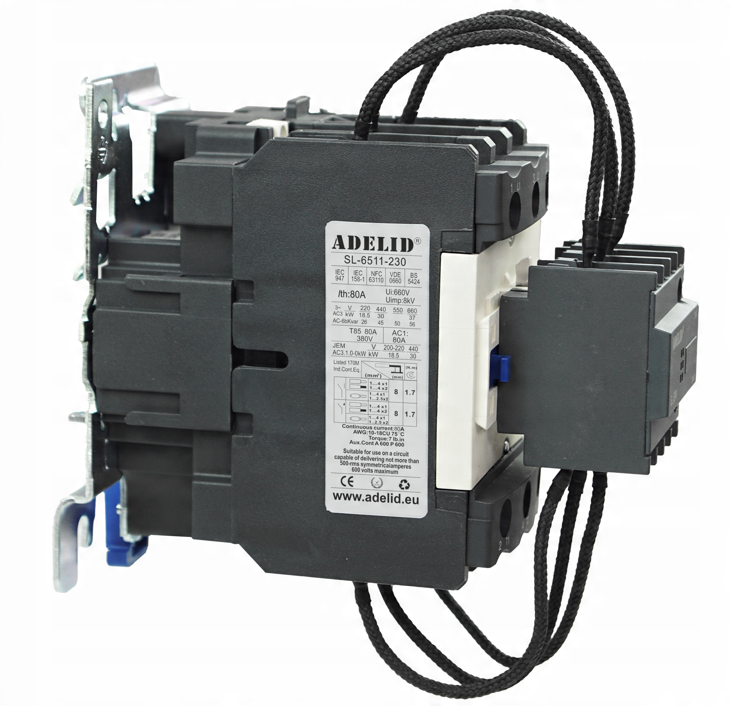 Stycznik marki Adelid to 3-biegunowy stycznik serii SL+SPK do załączania kondensatorów o mocy biernej do 45Kvar i prądzie znamionowym do 65A.