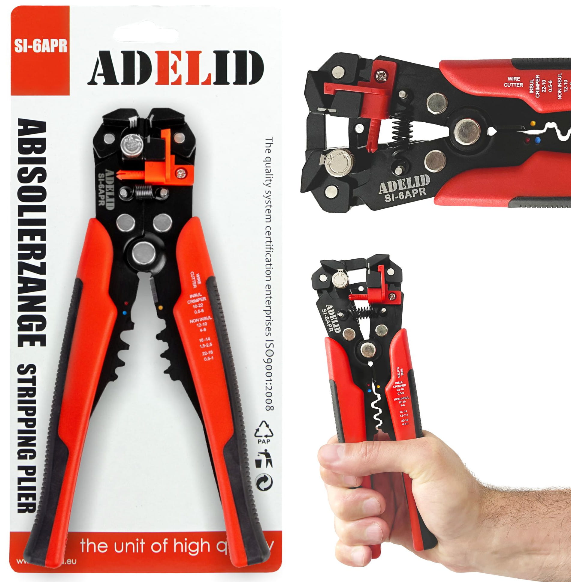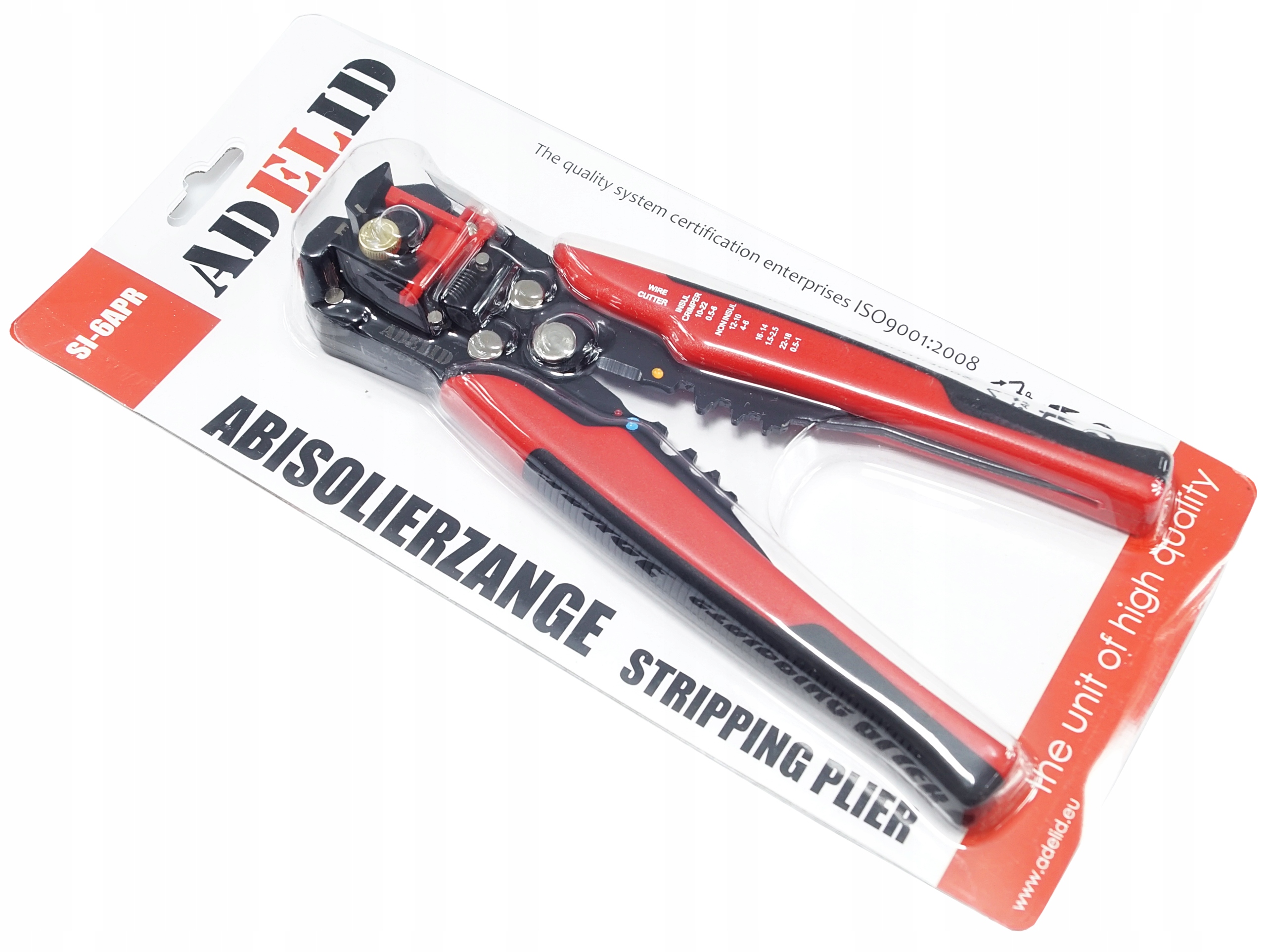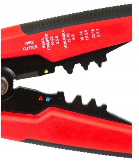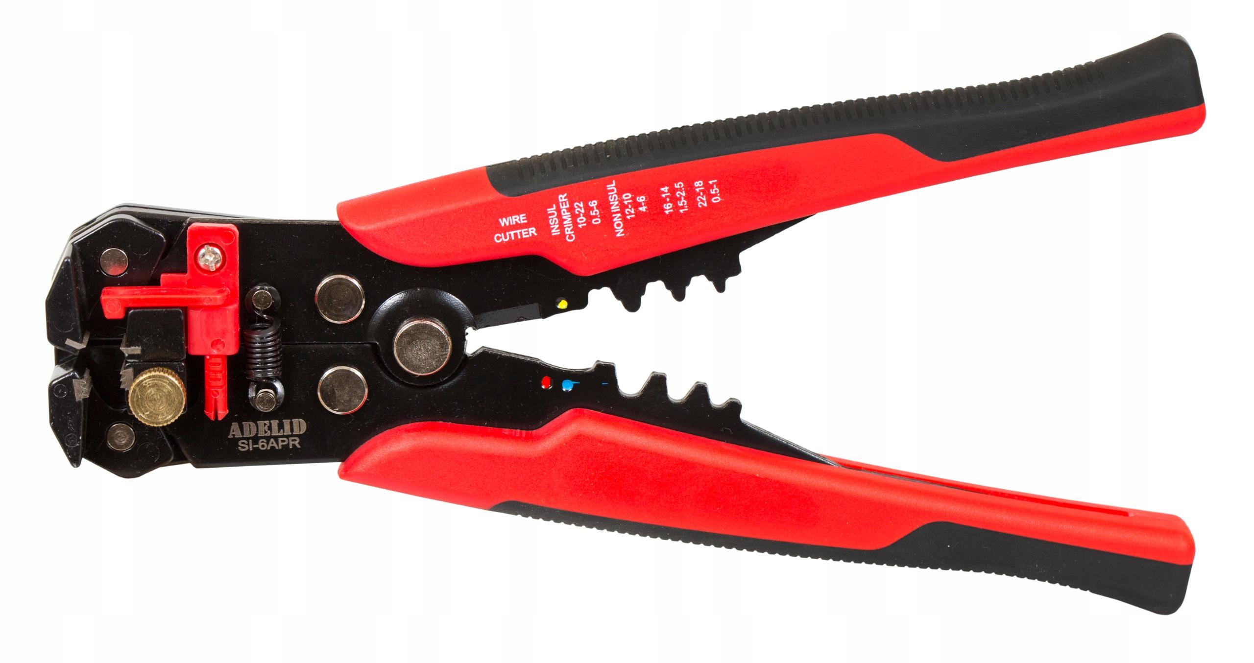 Uniwersalny ściągacz marki Adelid, służący do zdejmowania izolacji z przewodów jednożyłowych (linka, drut) lub z poszczególnych żył przewodów wielożyłowych. Nadaje się również do zaciskania końcówek konektorowych, izolowanych oraz nieizolowanych.Idealny do ściągania izolacji z kabli solarnych o przekroju 2,5 / 4 / 6 mm²