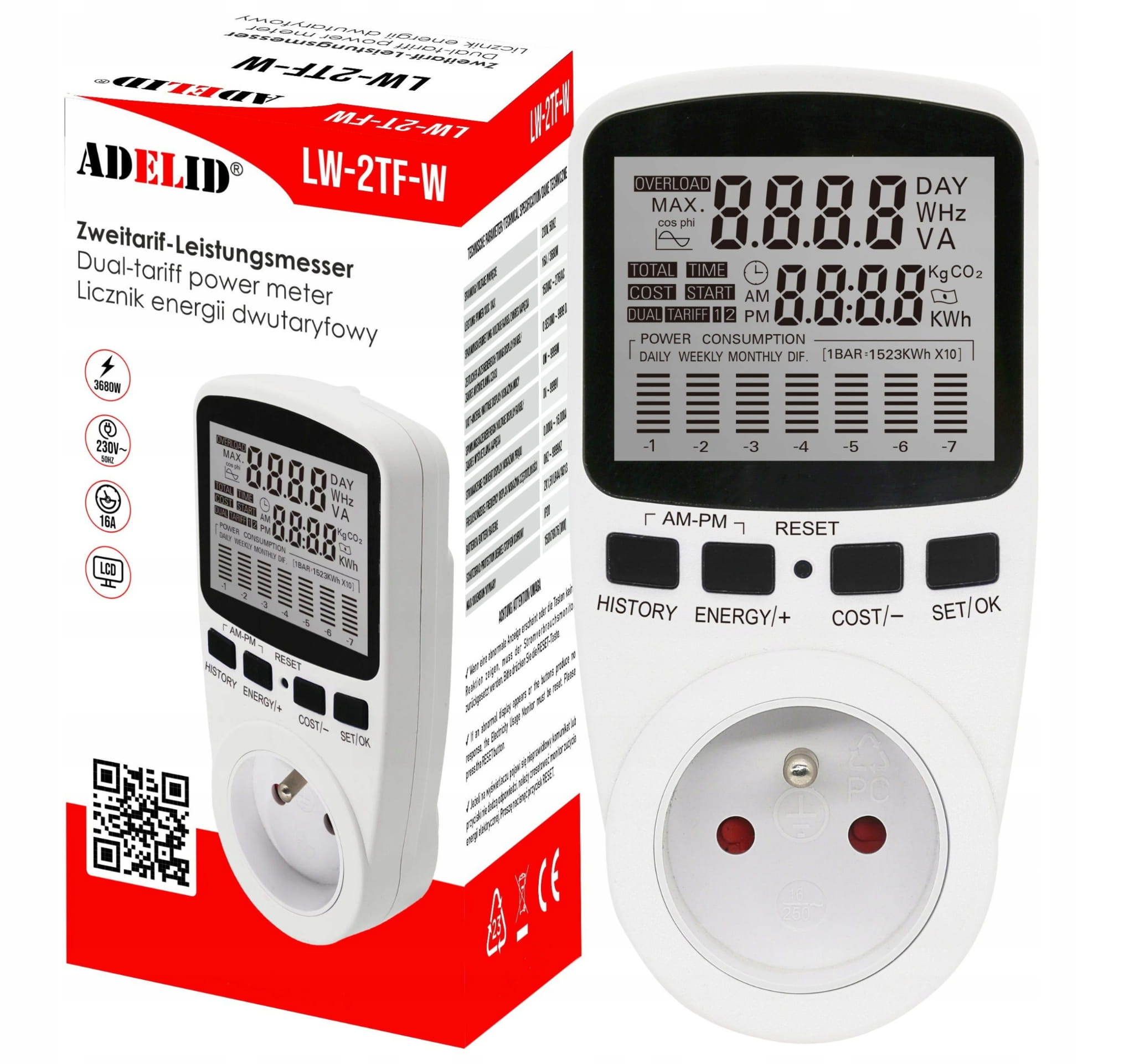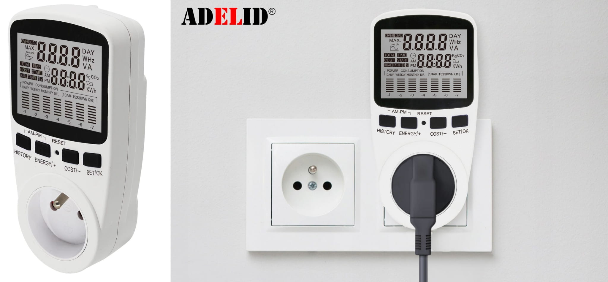 Licznik miernik energii elektrycznej watomierz, marki Adelid, z dużym wyświetlaczem LCD, w kolorze białym.