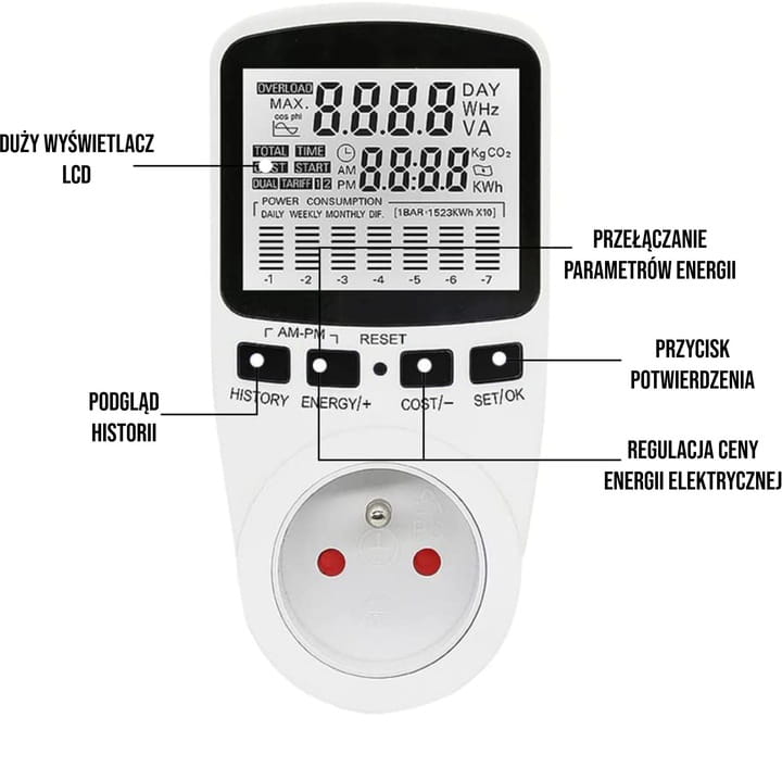✅ Podtrzymanie pamięci - watomierz wyposażony w wbudowany akumulator, dzięki któremu wszystkie dane o zużytej energii i jej kosztach zostaną zapisane w pamięci.
